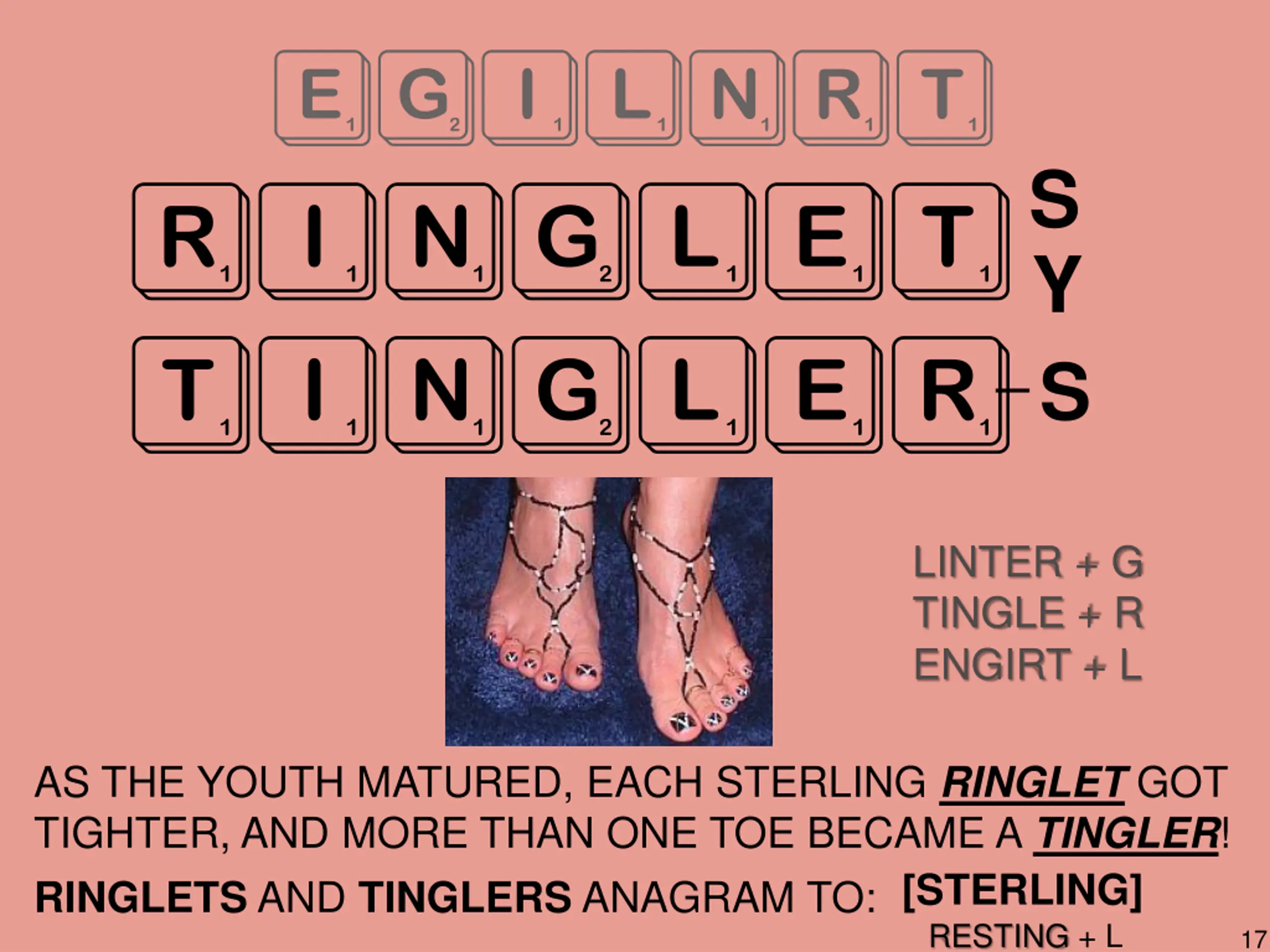 EGILNRT RINGLET TINGLER S Y _ S LINTER + G TINGLE + R ENGIRT + L AS THE YOUTH MATURED, EACH STERLING RINGLET GOT TIGHTER, AND MORE THAN ONE TOE BECAME A TINGLER! RINGLETS AND TINGLERS ANAGRAM TO: [STERLING] RESTING + L 17