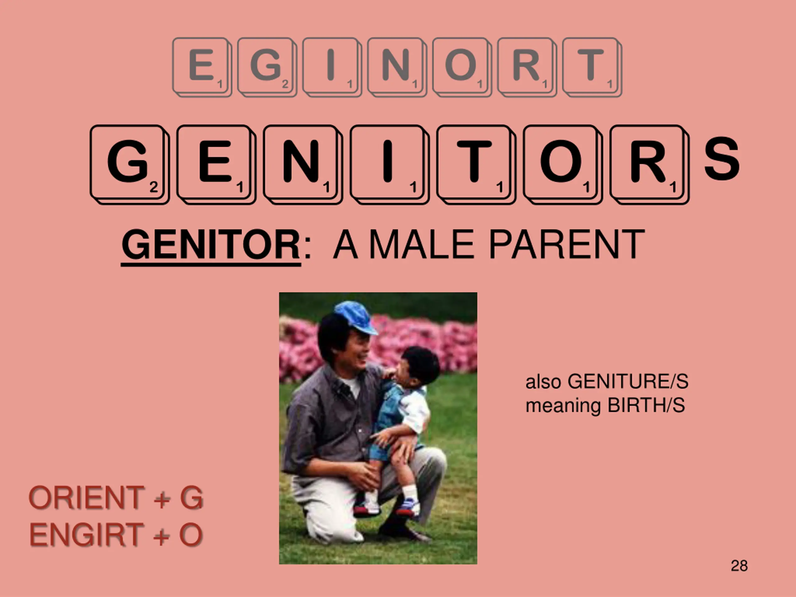 EGINORT genitor GENITOR: A MALE PARENT S also GENITURE/S meaning BIRTH/S ORIENT + G ENGIRT + O 28
