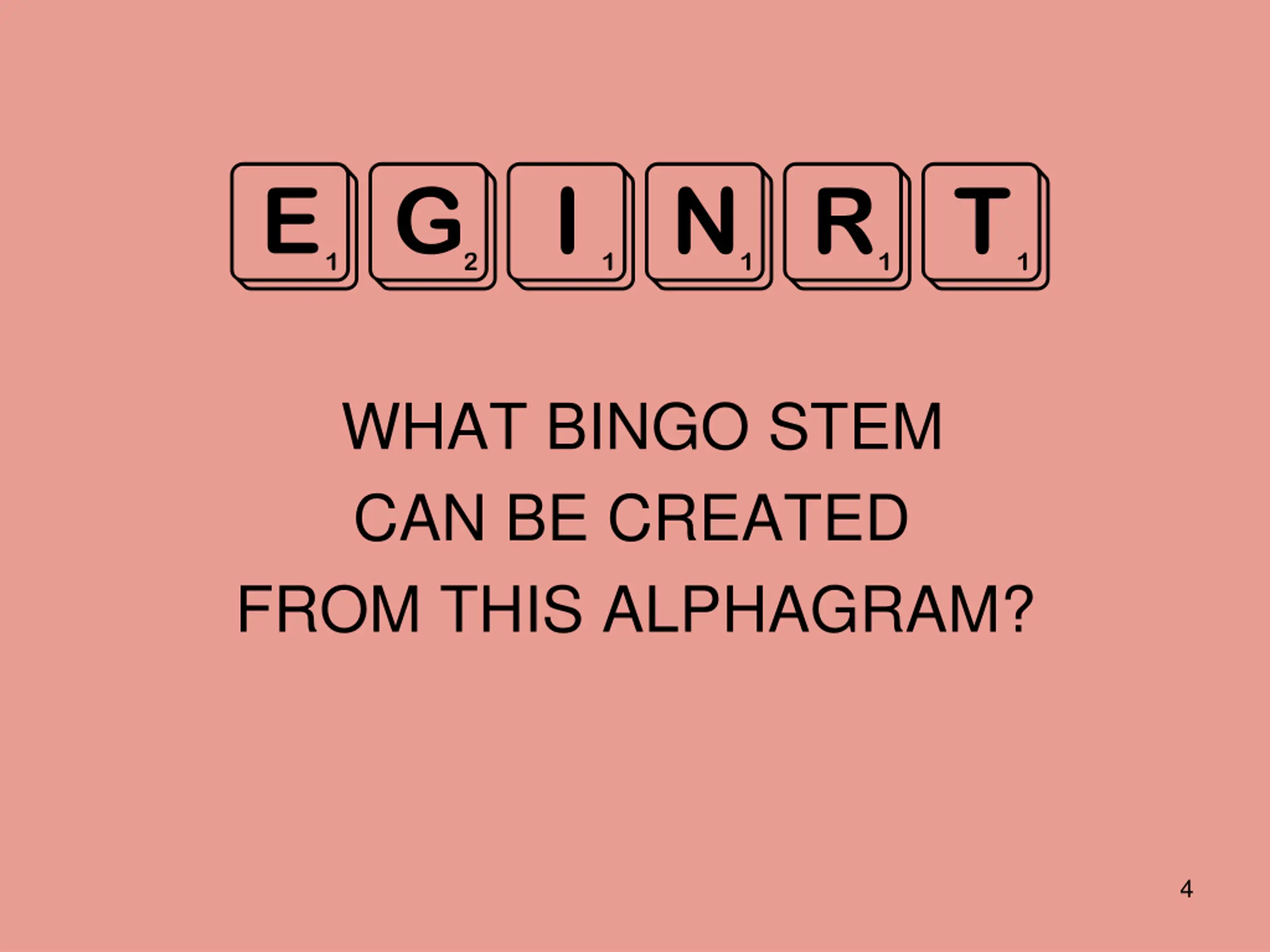 EGINRT WHAT BINGO STEM CAN BE CREATED FROM THIS ALPHAGRAM? 4