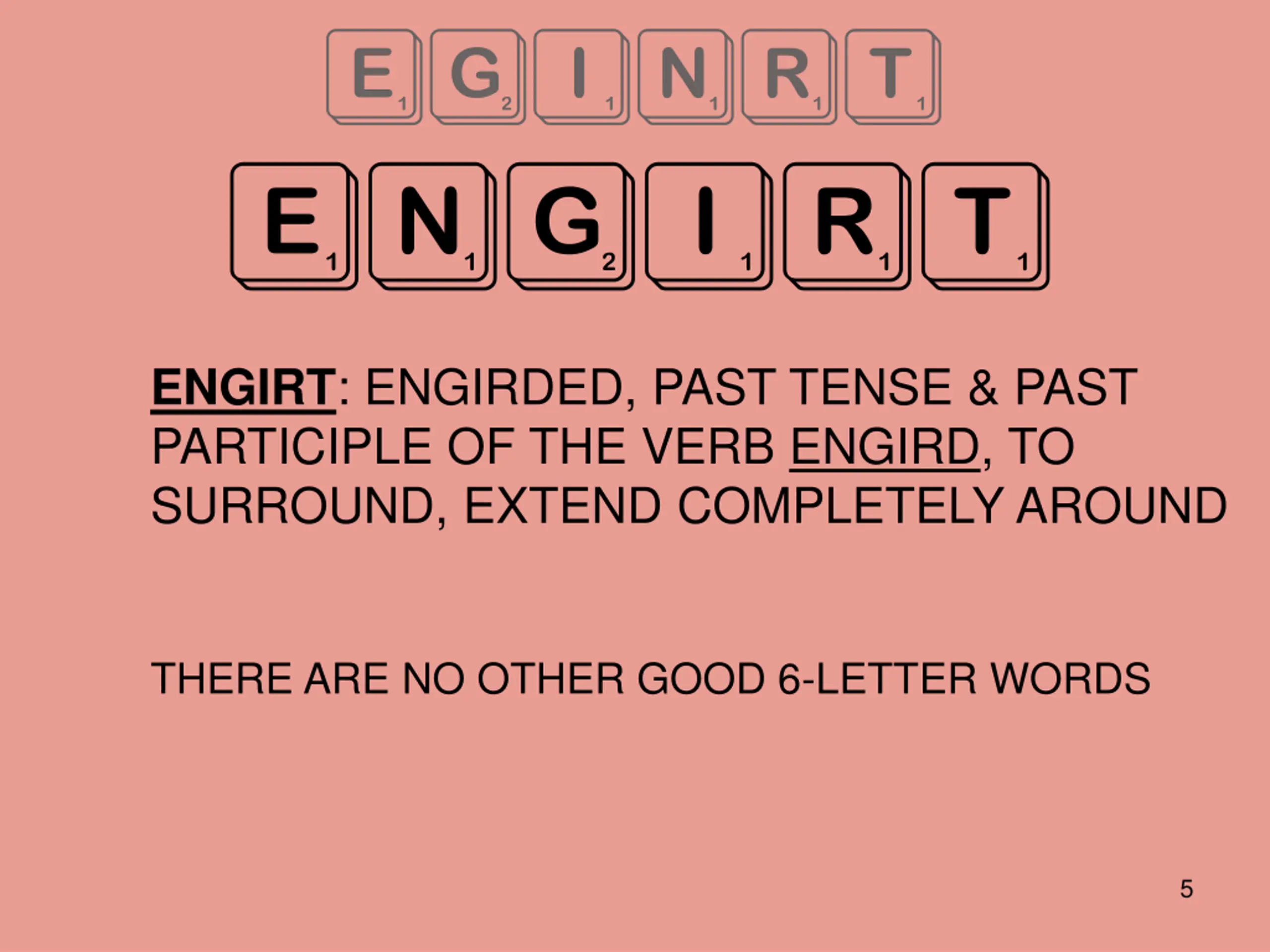 EGINRT ENGIRT ENGIRT: ENGIRDED, PAST TENSE & PAST PARTICIPLE OF THE VERB ENGIRD, TO SURROUND, EXTEND COMPLETELY AROUND THERE ARE NO OTHER GOOD 6-LETTER WORDS 5