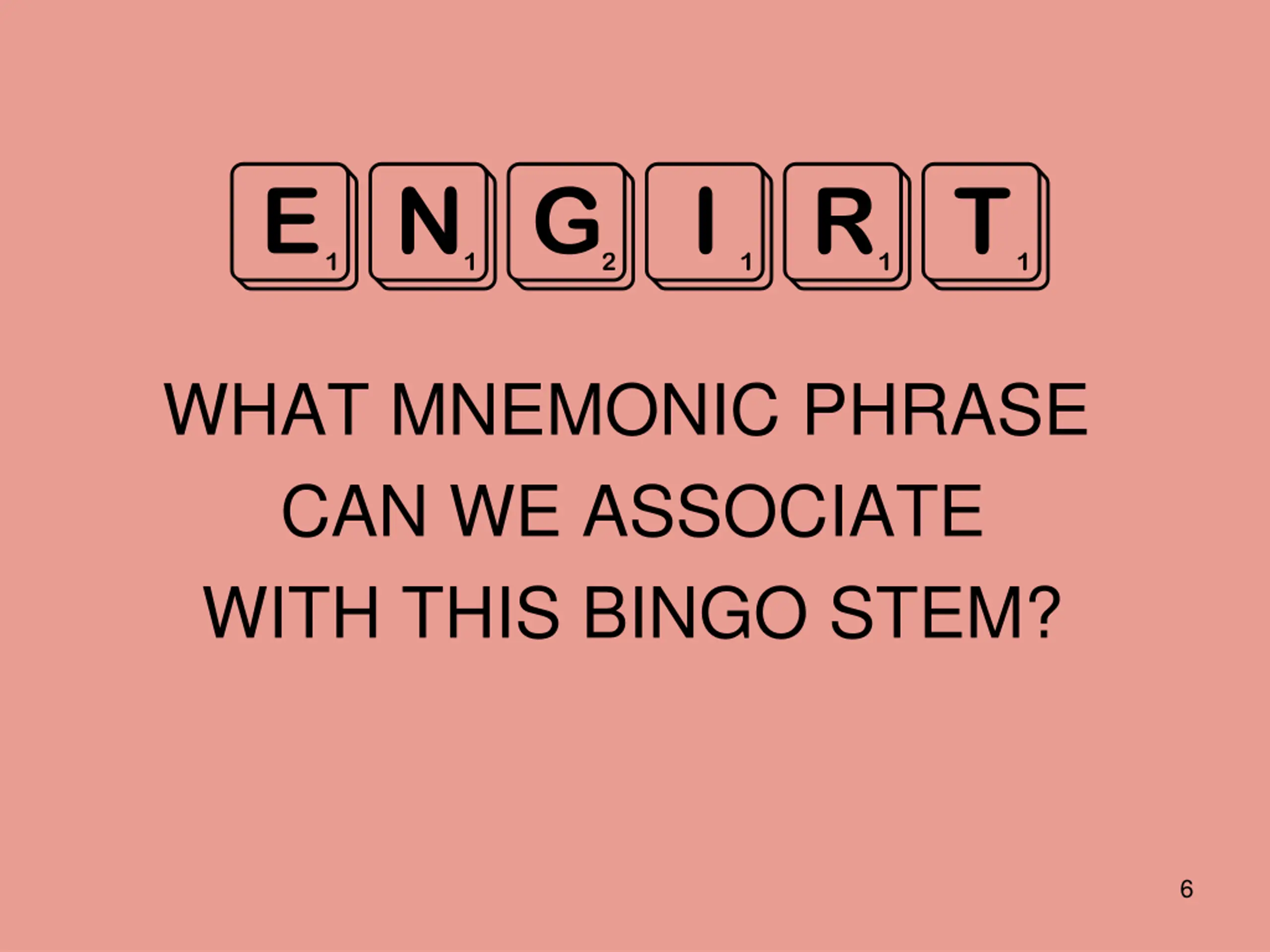 ENGIRT WHAT MNEMONIC PHRASE CAN WE ASSOCIATE WITH THIS BINGO STEM? 6