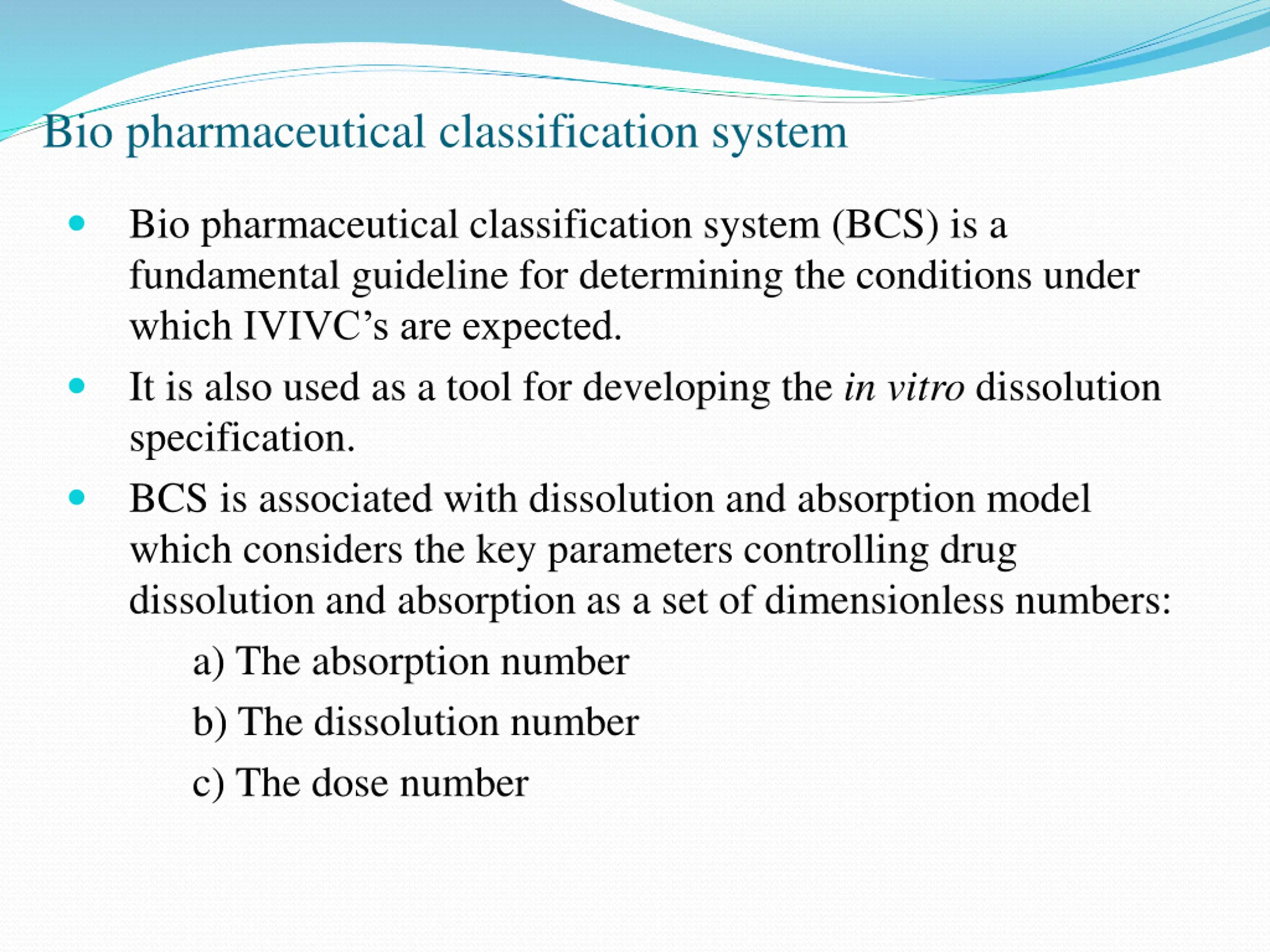 Bio pharmaceutical classification system Bio pharmaceutical classification system (BCS) is a fundamental guideline for determining the conditions under which IVIVC s are expected. It is also used as a tool for developing the in vitro dissolution specification. BCS is associated with dissolution and absorption model which considers the key parameters controlling drug dissolution and absorption as a set of dimensionless numbers: a) The absorption number b) The dissolution number c) The dose number