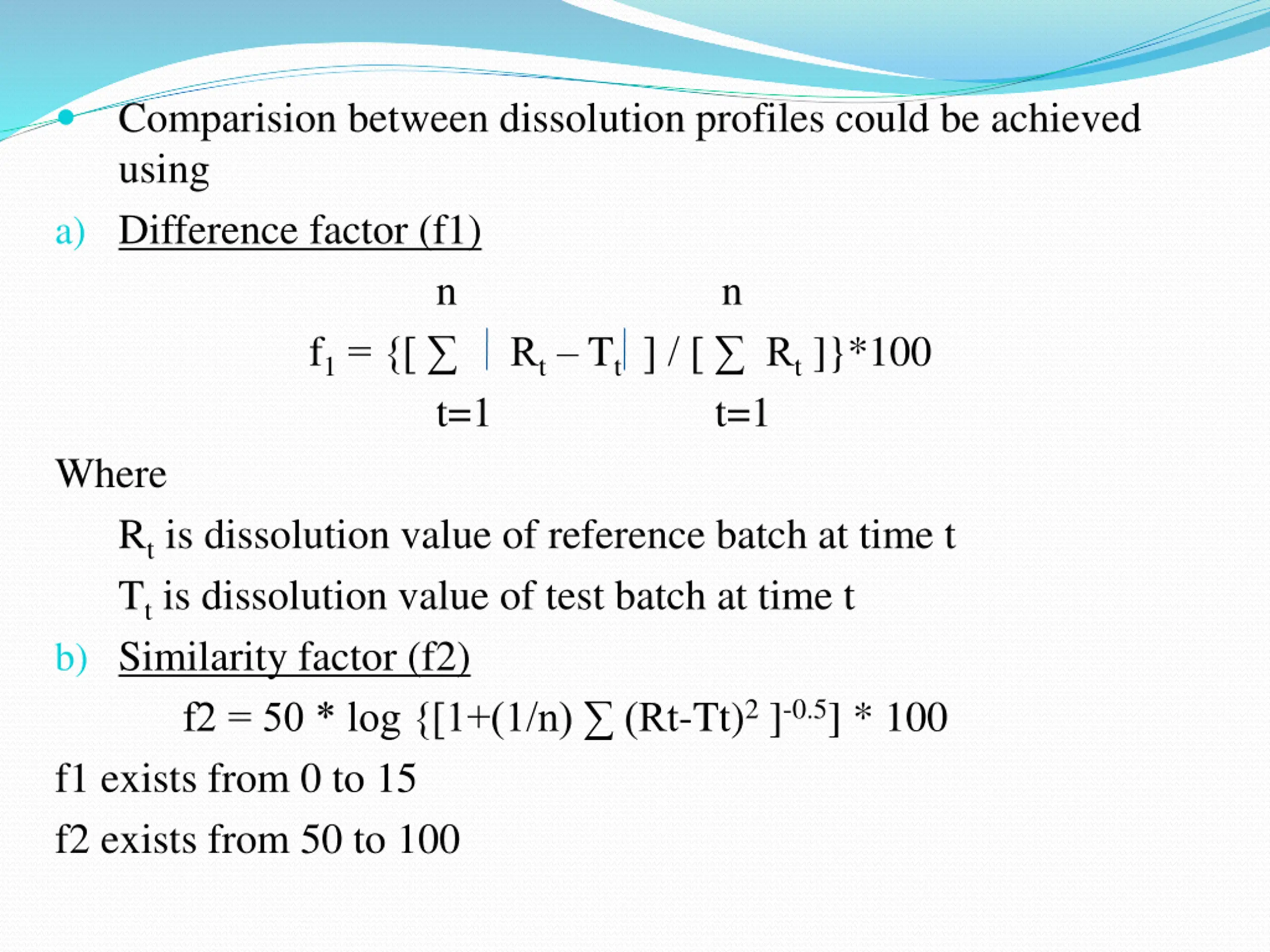 Comparision between dissolution profiles could be achieved using a) Difference factor (f1) n n f1= {[ Rt Tt] / [ Rt]}*100 t=1 t=1 Where Rtis dissolution value of reference batch at time t Ttis dissolution value of test batch at time t b) Similarity factor (f2) f2 = 50 * log {[1+(1/n) (Rt-Tt)2]-0.5] * 100 f1 exists from 0 to 15 f2 exists from 50 to 100