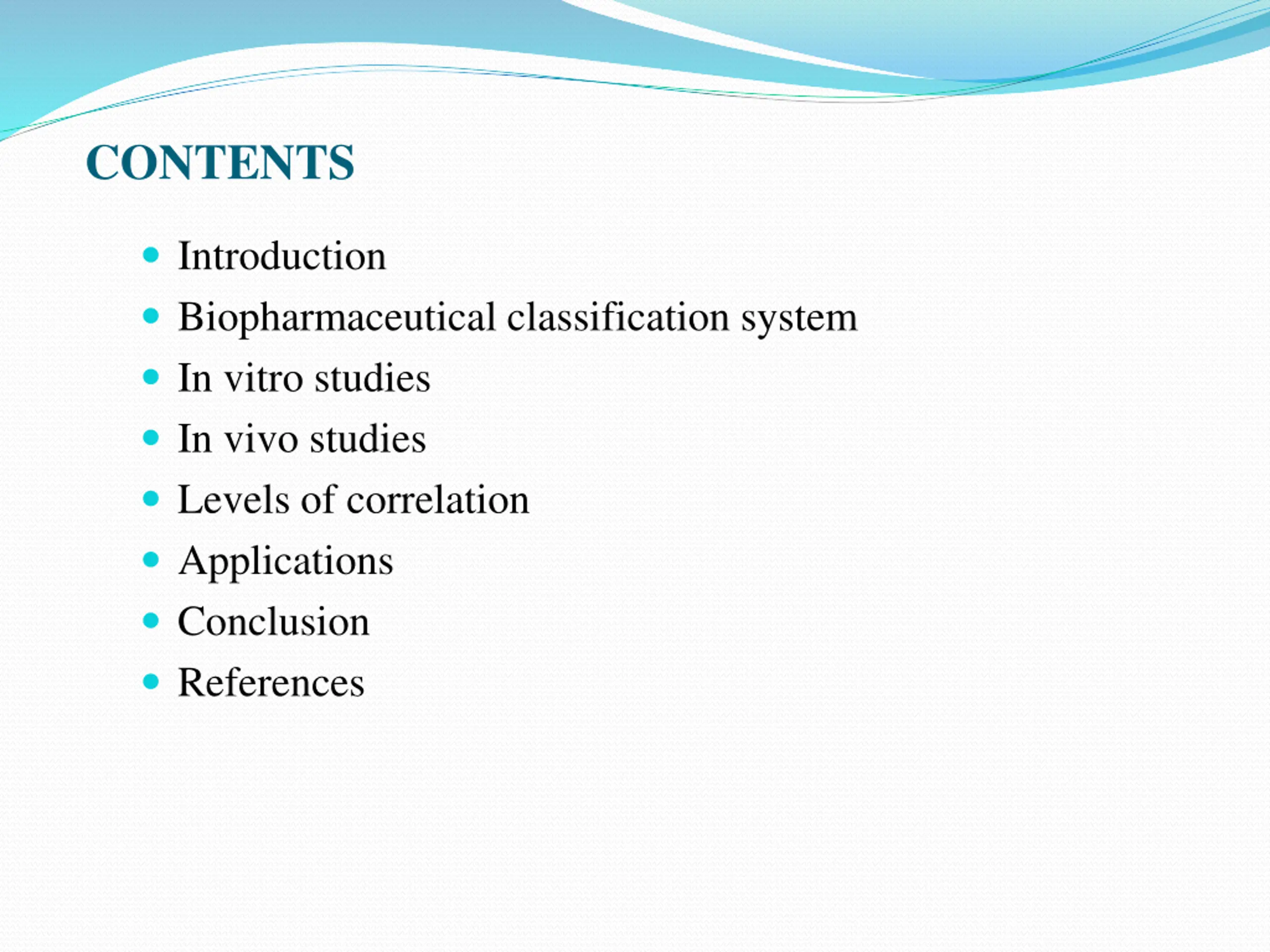 CONTENTS Introduction Biopharmaceutical classification system In vitro studies In vivo studies Levels of correlation Applications Conclusion References
