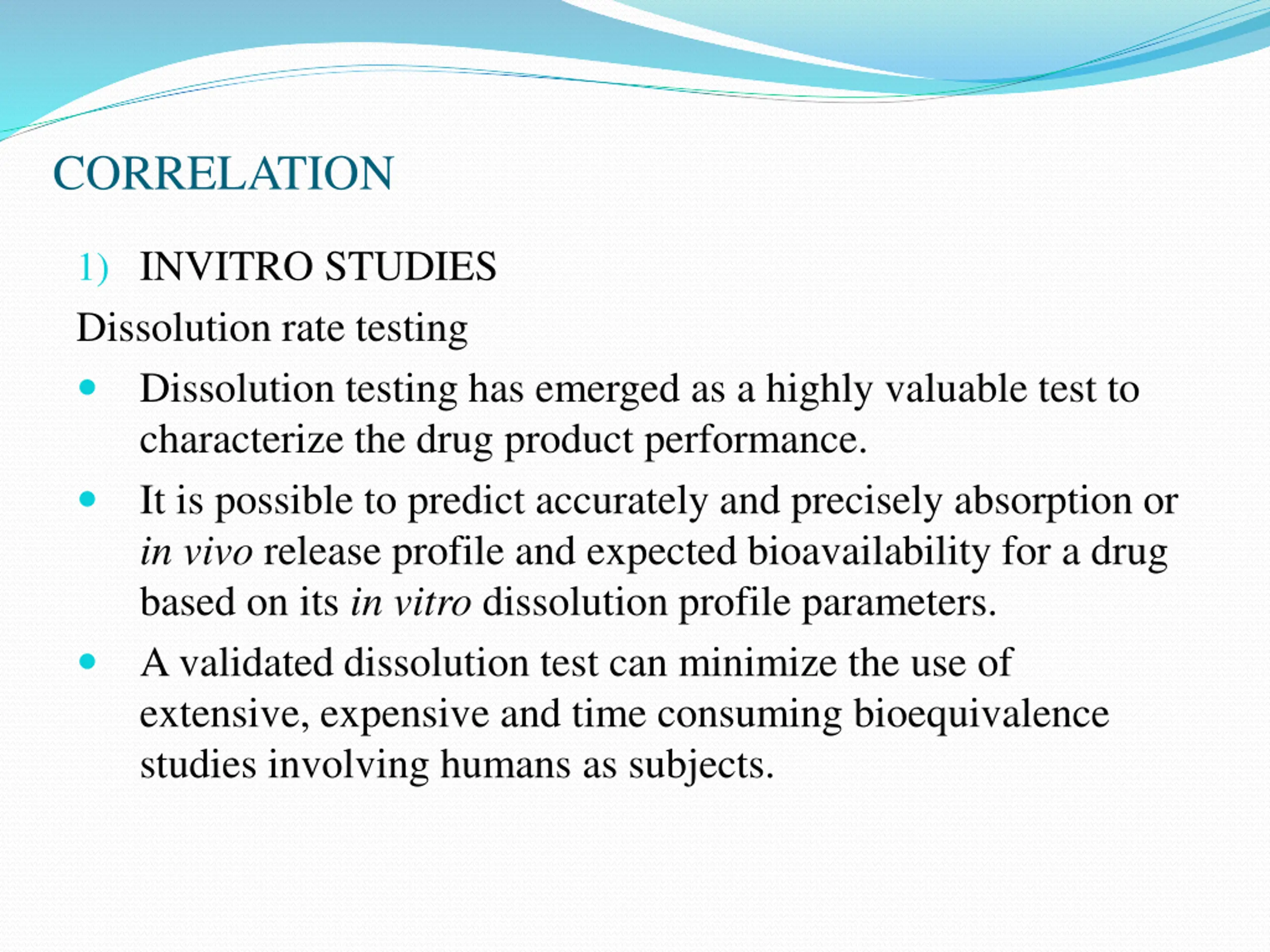 CORRELATION 1) INVITRO STUDIES Dissolution rate testing Dissolution testing has emerged as a highly valuable test to characterize the drug product performance. It is possible to predict accurately and precisely absorption or in vivo release profile and expected bioavailability for a drug based on its in vitro dissolution profile parameters. A validated dissolution test can minimize the use of extensive, expensive and time consuming bioequivalence studies involving humans as subjects.