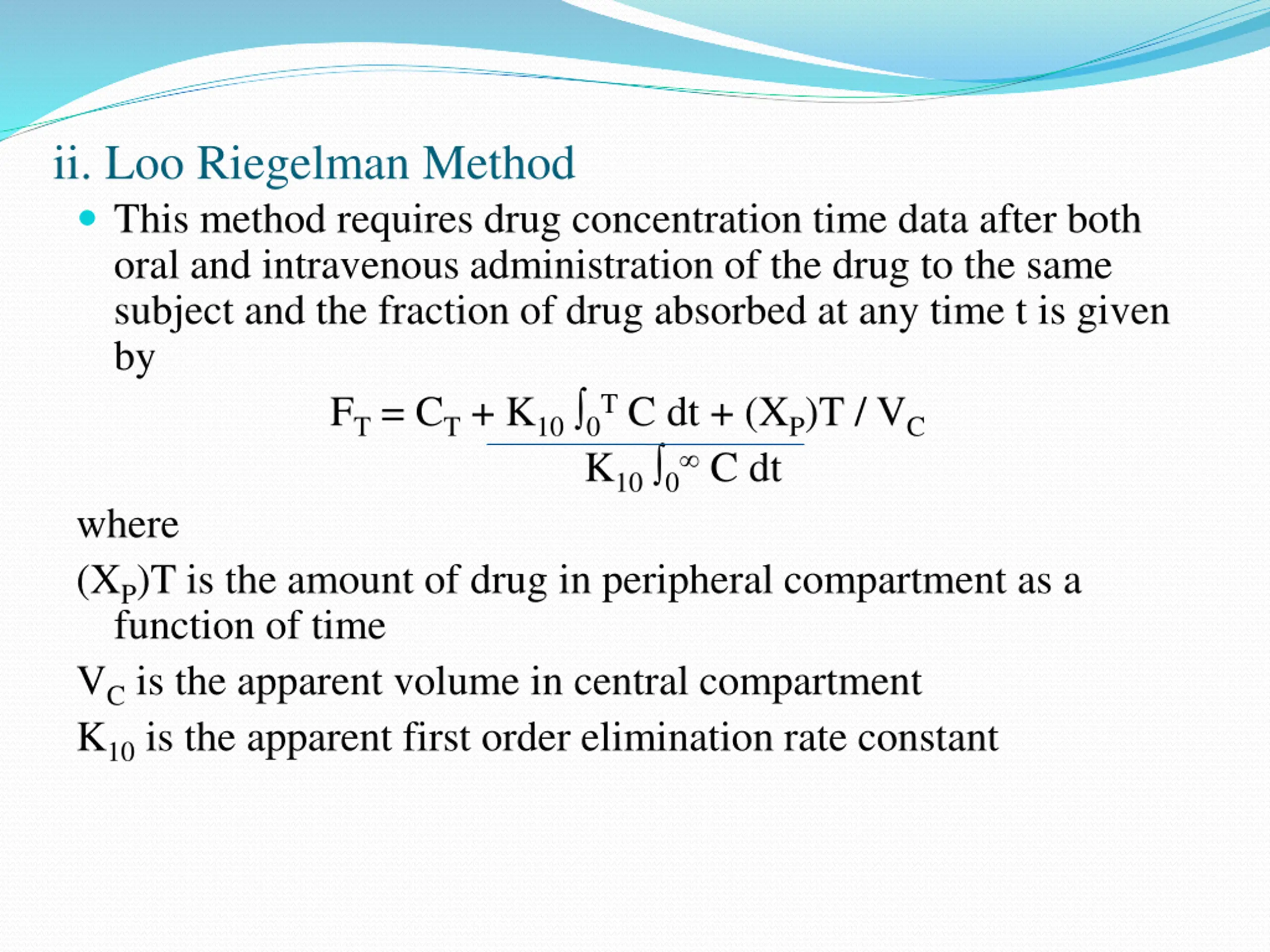 ii. Loo Riegelman Method This method requires drug concentration time data after both oral and intravenous administration of the drug to the same subject and the fraction of drug absorbed at any time t is given by FT= CT+ K10 0TC dt + (XP)T / VC K10 0 C dt where (XP)T is the amount of drug in peripheral compartment as a function of time VCis the apparent volume in central compartment K10is the apparent first order elimination rate constant