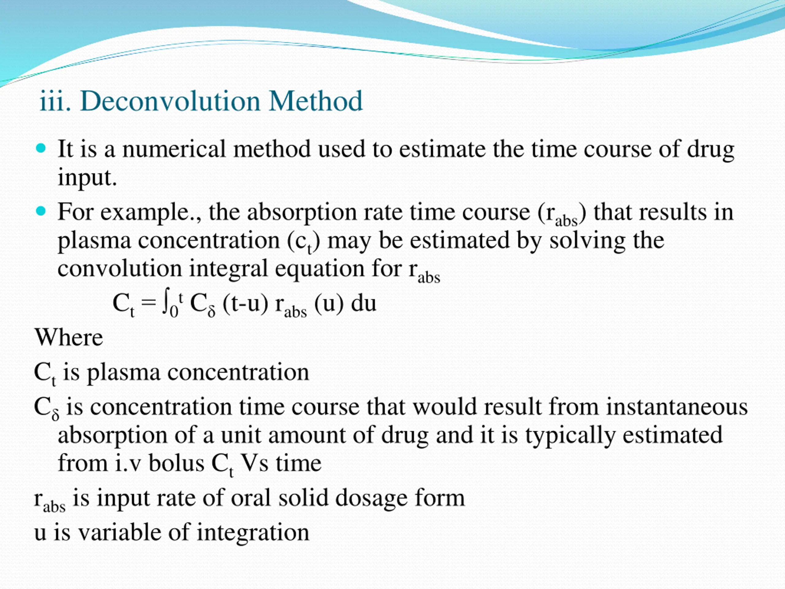 iii. Deconvolution Method It is a numerical method used to estimate the time course of drug input. For example., the absorption rate time course (rabs) that results in plasma concentration (ct) may be estimated by solving the convolution integral equation for rabs Ct= 0tC (t-u) rabs(u) du Where Ctis plasma concentration C is concentration time course that would result from instantaneous absorption of a unit amount of drug and it is typically estimated from i.v bolus CtVs time rabsis input rate of oral solid dosage form u is variable of integration