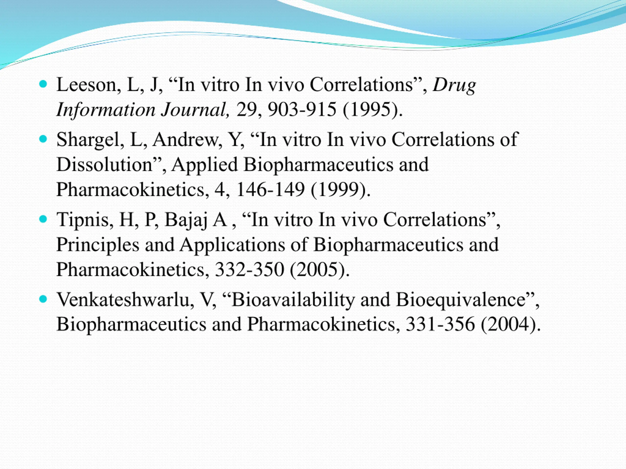 Leeson, L, J, In vitro In vivo Correlations, Drug Information Journal, 29, 903-915 (1995). Shargel, L, Andrew, Y, In vitro In vivo Correlations of Dissolution , Applied Biopharmaceutics and Pharmacokinetics, 4, 146-149 (1999). Tipnis, H, P, Bajaj A , In vitro In vivo Correlations , Principles and Applications of Biopharmaceutics and Pharmacokinetics, 332-350 (2005). Venkateshwarlu, V, Bioavailability and Bioequivalence , Biopharmaceutics and Pharmacokinetics, 331-356 (2004).