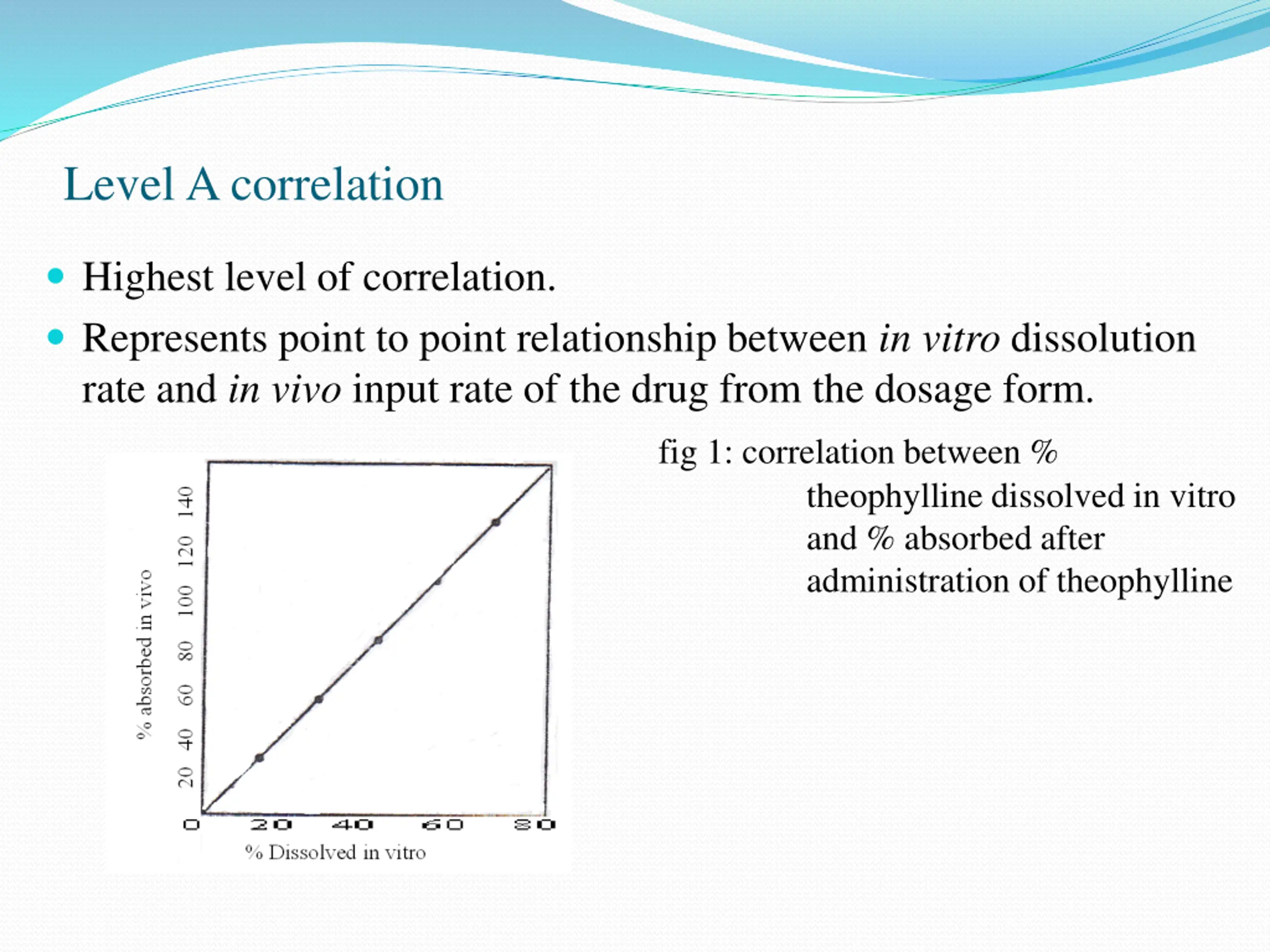 Level A correlation Highest level of correlation. Represents point to point relationship between in vitro dissolution rate and in vivo input rate of the drug from the dosage form. fig 1: correlation between % theophylline dissolved in vitro and % absorbed after administration of theophylline