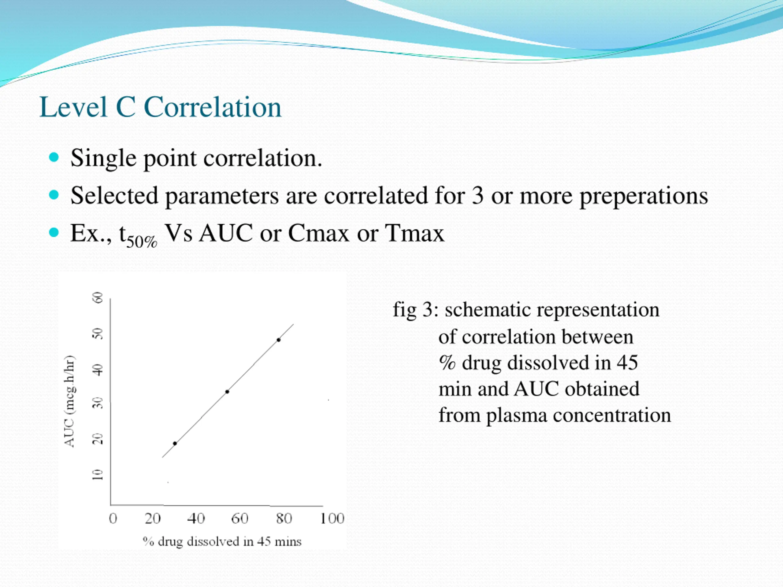 Level C Correlation Single point correlation. Selected parameters are correlated for 3 or more preperations Ex., t50%Vs AUC or Cmax or Tmax fig 3: schematic representation of correlation between % drug dissolved in 45 min and AUC obtained from plasma concentration