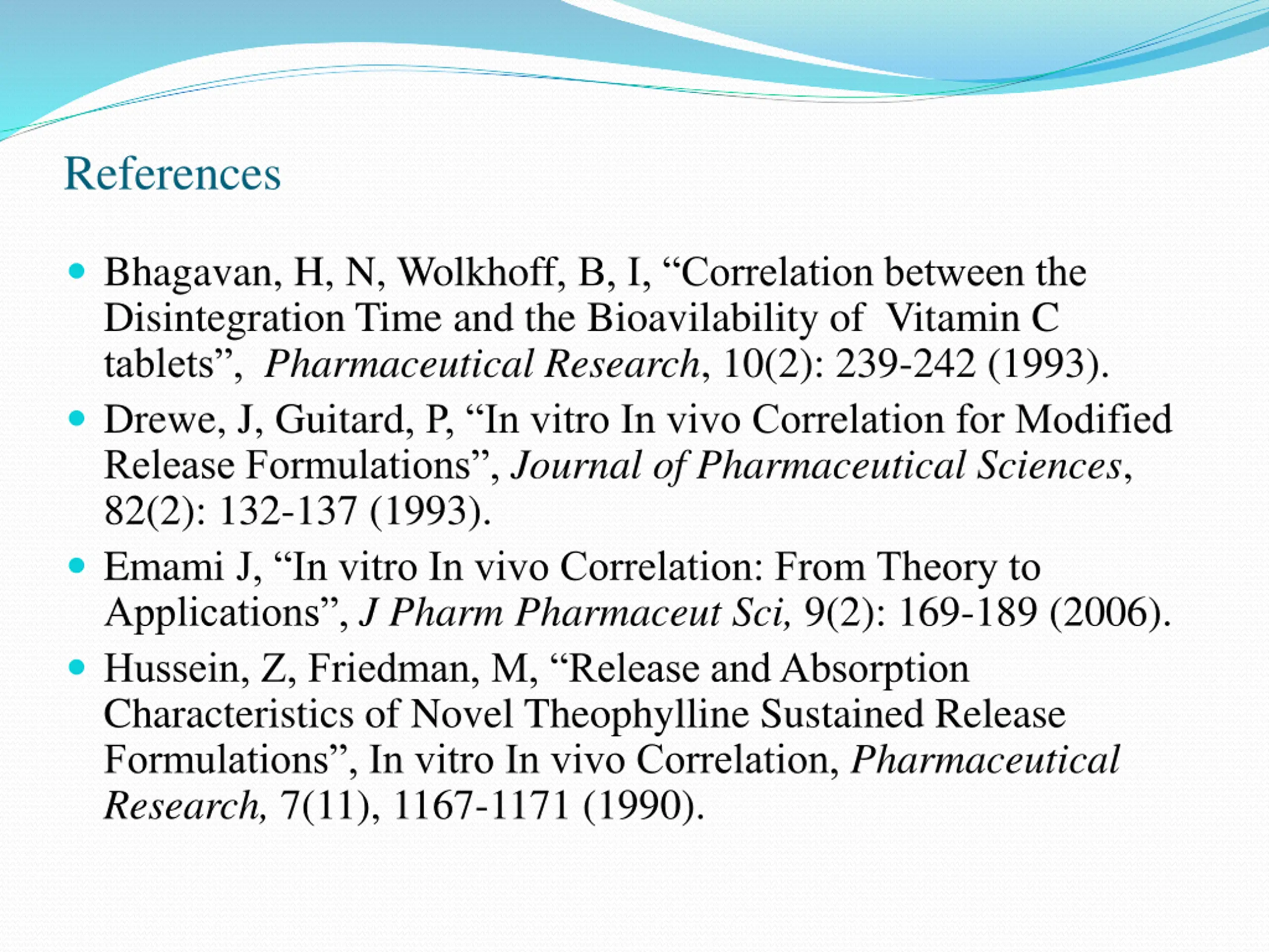 References Bhagavan, H, N, Wolkhoff, B, I, Correlation between the Disintegration Time and the Bioavilability of Vitamin C tablets , Pharmaceutical Research, 10(2): 239-242 (1993). Drewe, J, Guitard, P, In vitro In vivo Correlation for Modified Release Formulations , Journal of Pharmaceutical Sciences, 82(2): 132-137 (1993). Emami J, In vitro In vivo Correlation: From Theory to Applications , J Pharm Pharmaceut Sci, 9(2): 169-189 (2006). Hussein, Z, Friedman, M, Release and Absorption Characteristics of Novel Theophylline Sustained Release Formulations , In vitro In vivo Correlation, Pharmaceutical Research, 7(11), 1167-1171 (1990).
