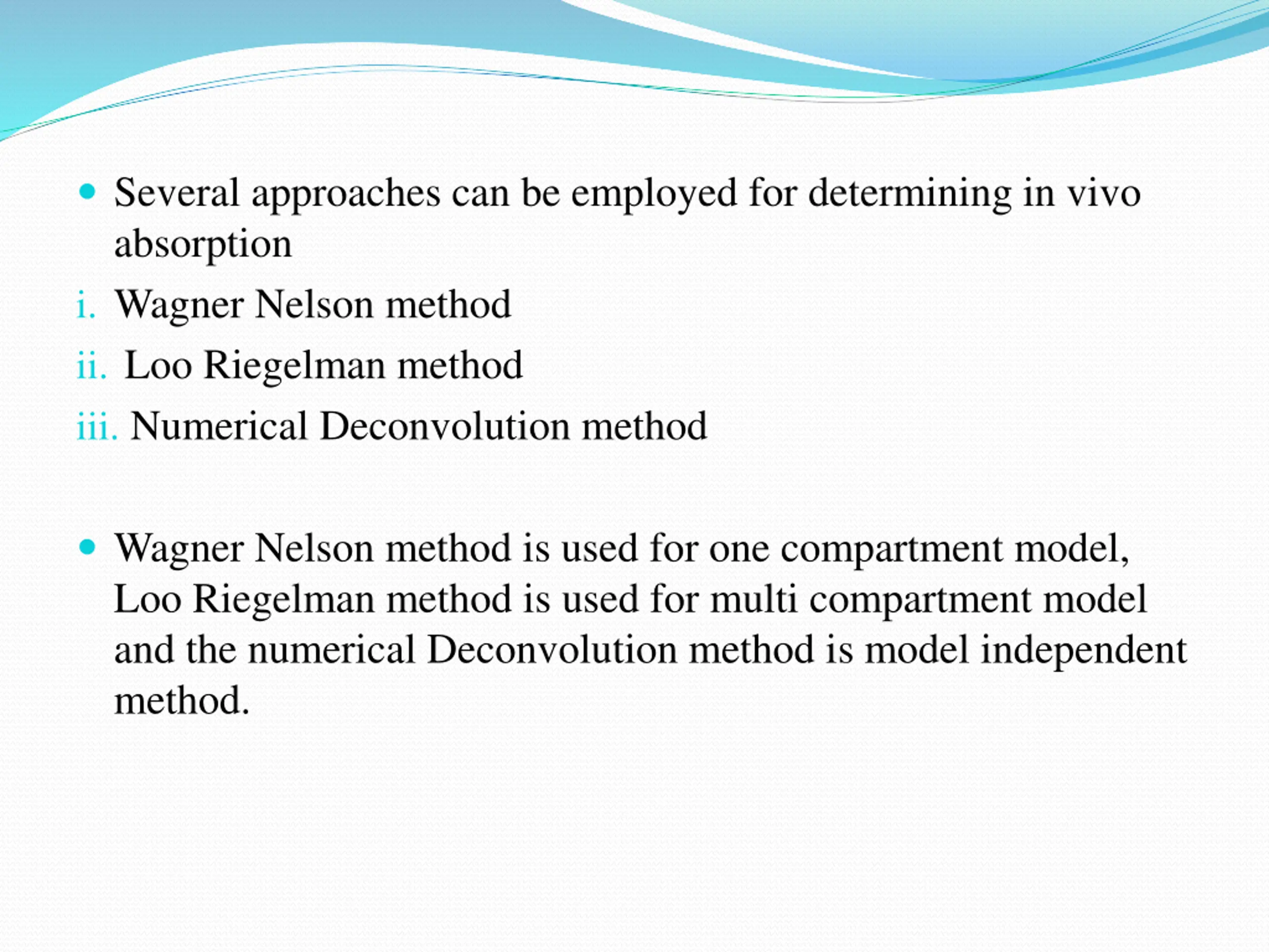 Several approaches can be employed for determining in vivo absorption i. Wagner Nelson method ii. Loo Riegelman method iii. Numerical Deconvolution method Wagner Nelson method is used for one compartment model, Loo Riegelman method is used for multi compartment model and the numerical Deconvolution method is model independent method.
