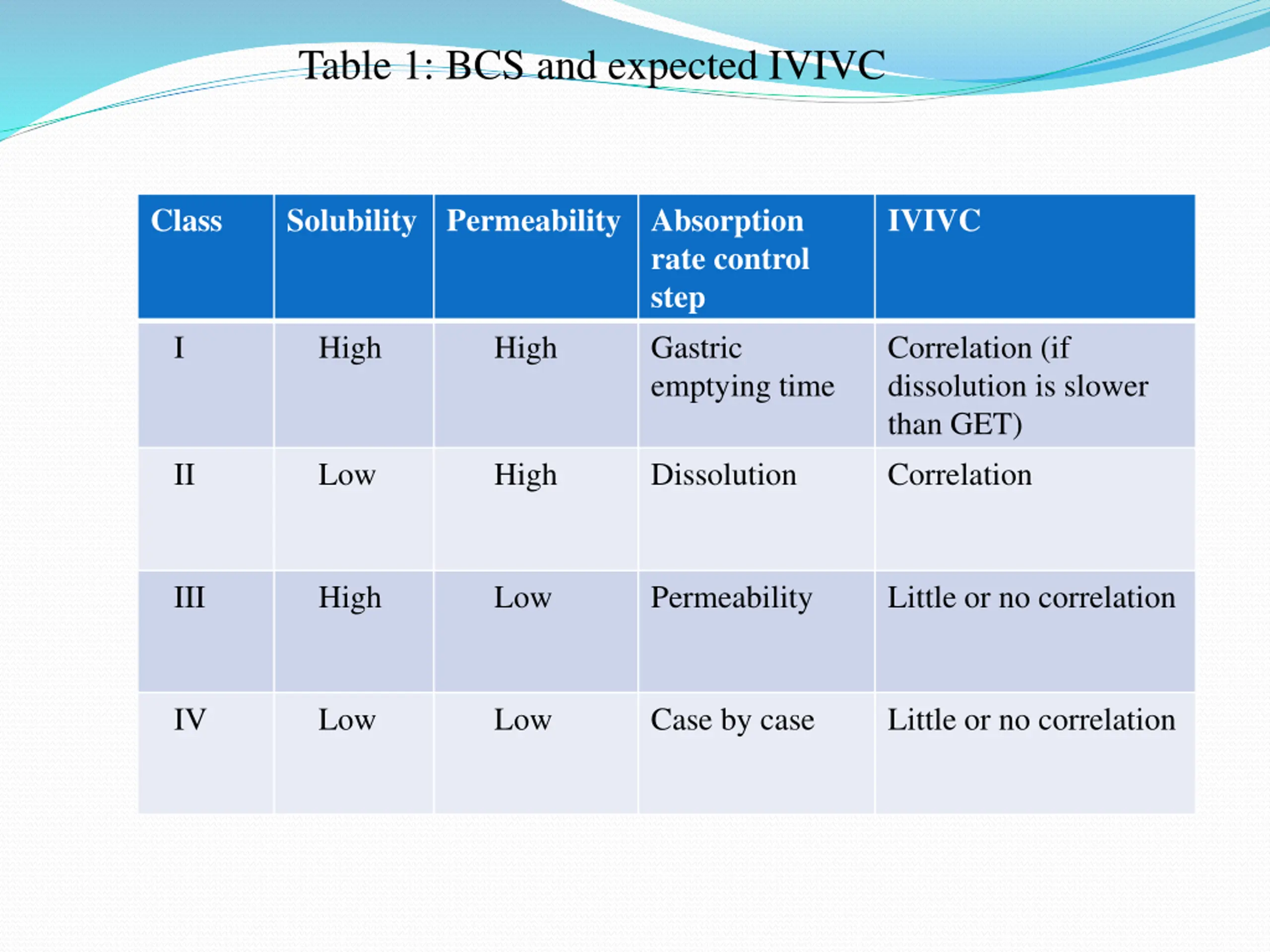 Table 1: BCS and expected IVIVC Class Solubility Permeability Absorption rate control step Gastric emptying time IVIVC I High High Correlation (if dissolution is slower than GET) Correlation II Low High Dissolution III High Low Permeability Little or no correlation IV Low Low Case by case Little or no correlation