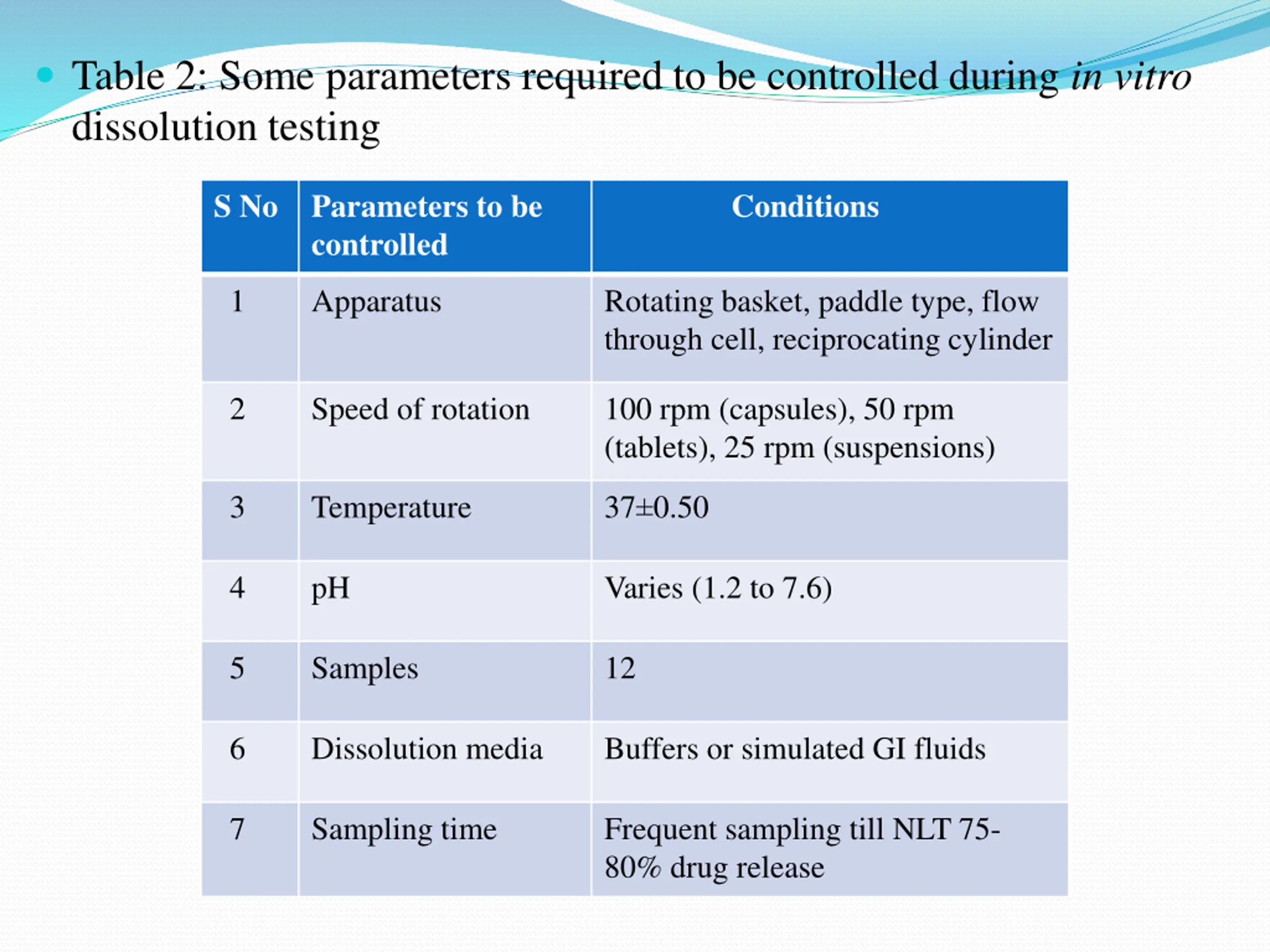 Table 2: Some parameters required to be controlled during in vitro dissolution testing S No Parameters to be controlled Conditions 1 Apparatus Rotating basket, paddle type, flow through cell, reciprocating cylinder 2 Speed of rotation 100 rpm (capsules), 50 rpm (tablets), 25 rpm (suspensions) 3 Temperature 37 0.50 4 pH Varies (1.2 to 7.6) 5 Samples 12 6 Dissolution media Buffers or simulated GI fluids 7 Sampling time Frequent sampling till NLT 75- 80% drug release