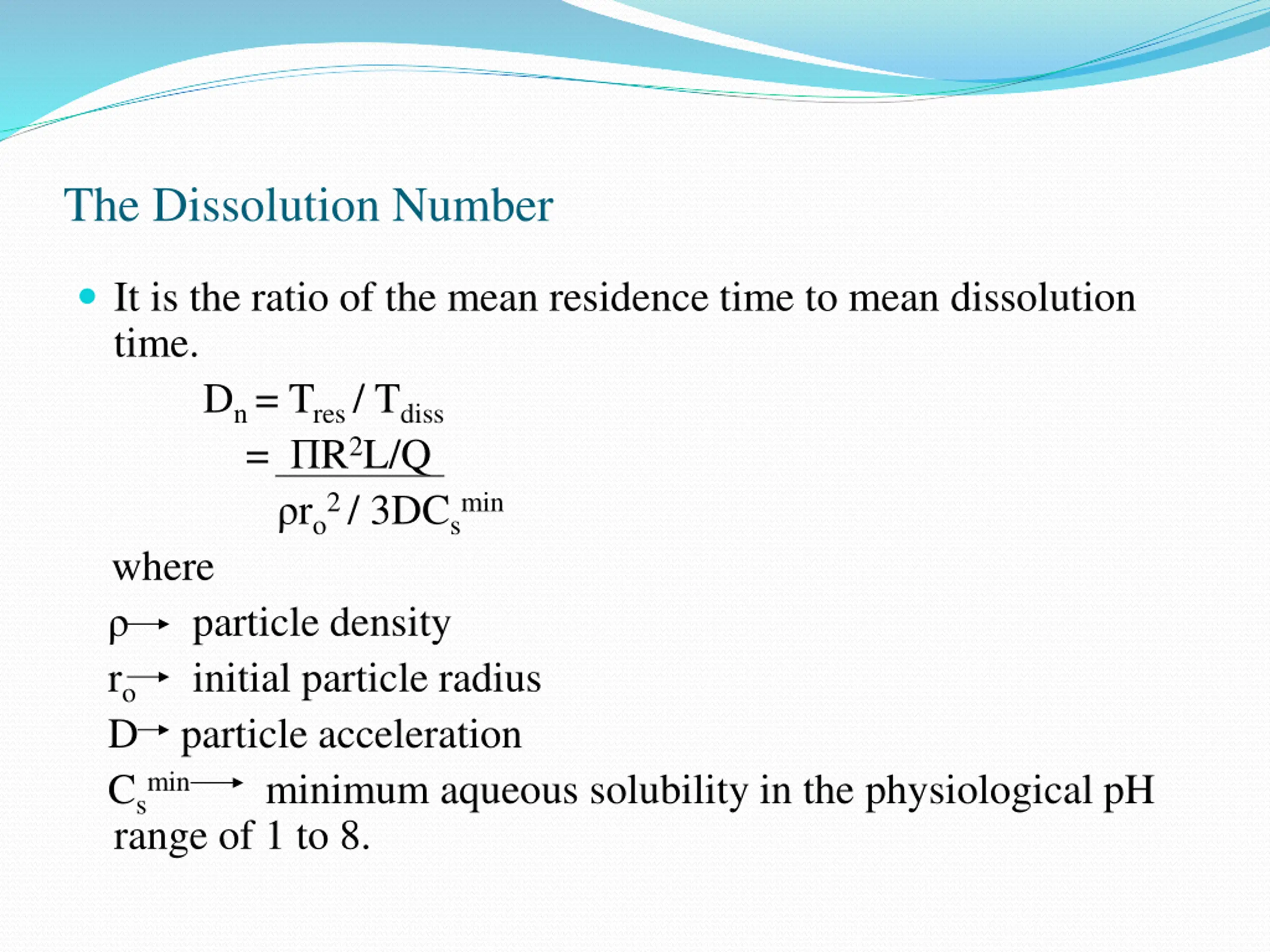 The Dissolution Number It is the ratio of the mean residence time to mean dissolution time. Dn = Tres / Tdiss = R2L/Q ro2 / 3DCsmin where particle density ro initial particle radius D particle acceleration Csmin minimum aqueous solubility in the physiological pH range of 1 to 8.