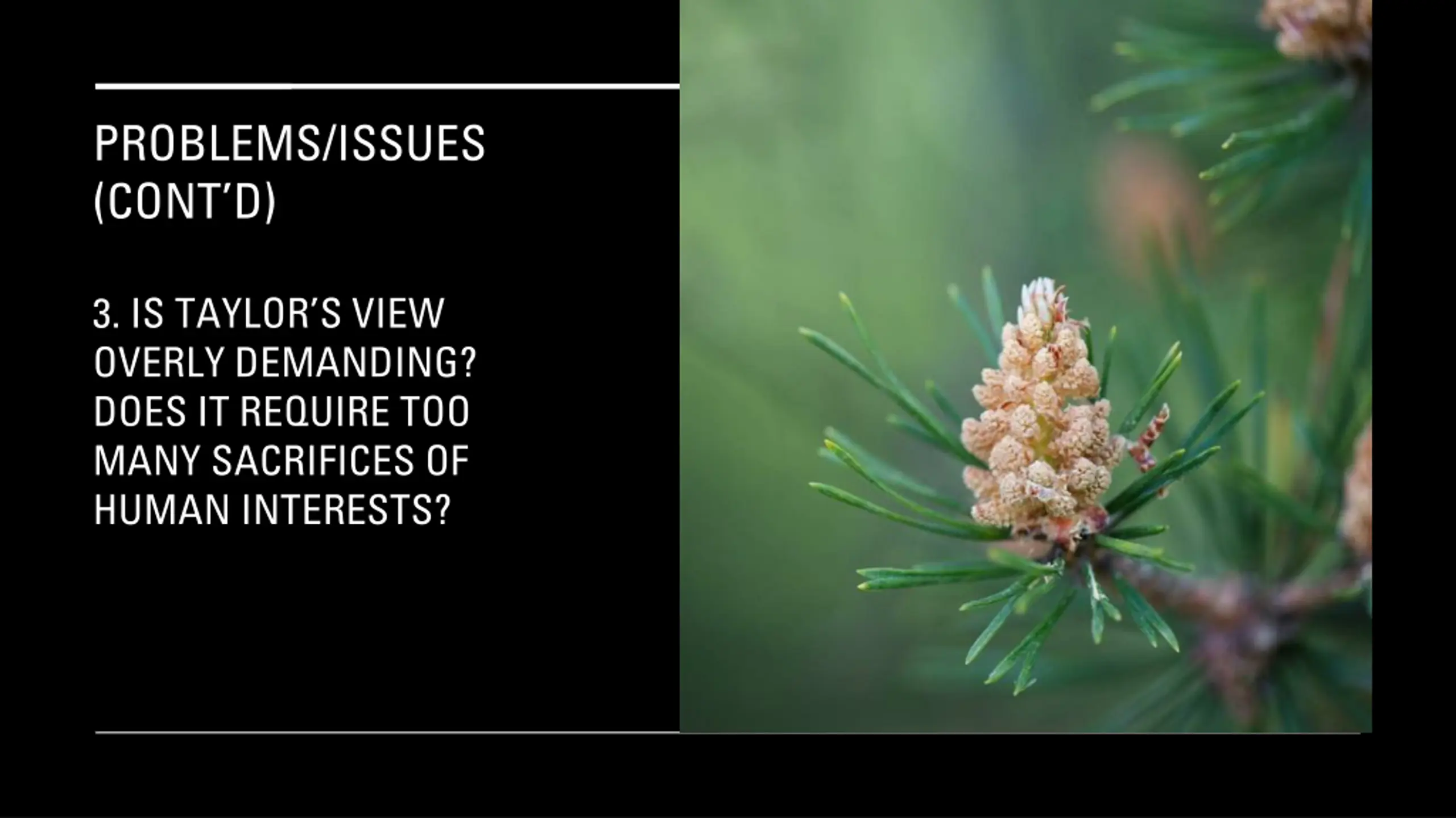 PROBLEMS/ISSUES (CONT D) 3. IS TAYLOR S VIEW OVERLY DEMANDING? DOES IT REQUIRE TOO MANY SACRIFICES OF HUMAN INTERESTS?