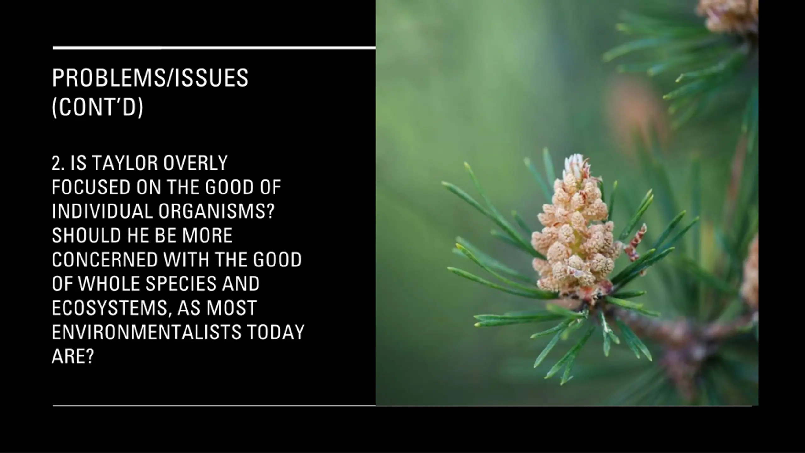 PROBLEMS/ISSUES (CONT D) 2. IS TAYLOR OVERLY FOCUSED ON THE GOOD OF INDIVIDUAL ORGANISMS? SHOULD HE BE MORE CONCERNED WITH THE GOOD OF WHOLE SPECIES AND ECOSYSTEMS, AS MOST ENVIRONMENTALISTS TODAY ARE?
