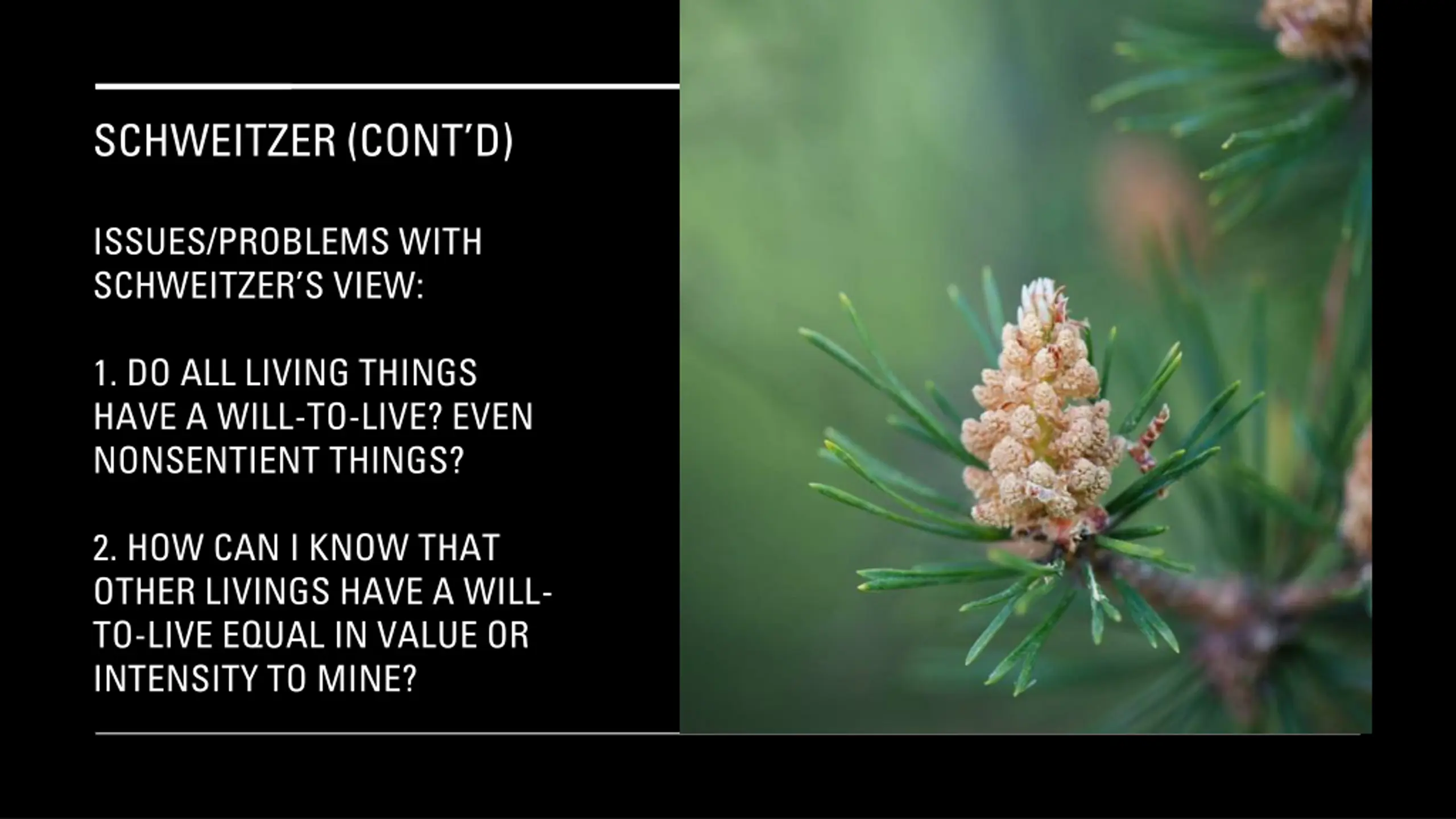 SCHWEITZER (CONTD) ISSUES/PROBLEMS WITH SCHWEITZER S VIEW: 1. DO ALL LIVING THINGS HAVE A WILL-TO-LIVE? EVEN NONSENTIENT THINGS? 2. HOW CAN I KNOW THAT OTHER LIVINGS HAVE A WILL- TO-LIVE EQUAL IN VALUE OR INTENSITY TO MINE?