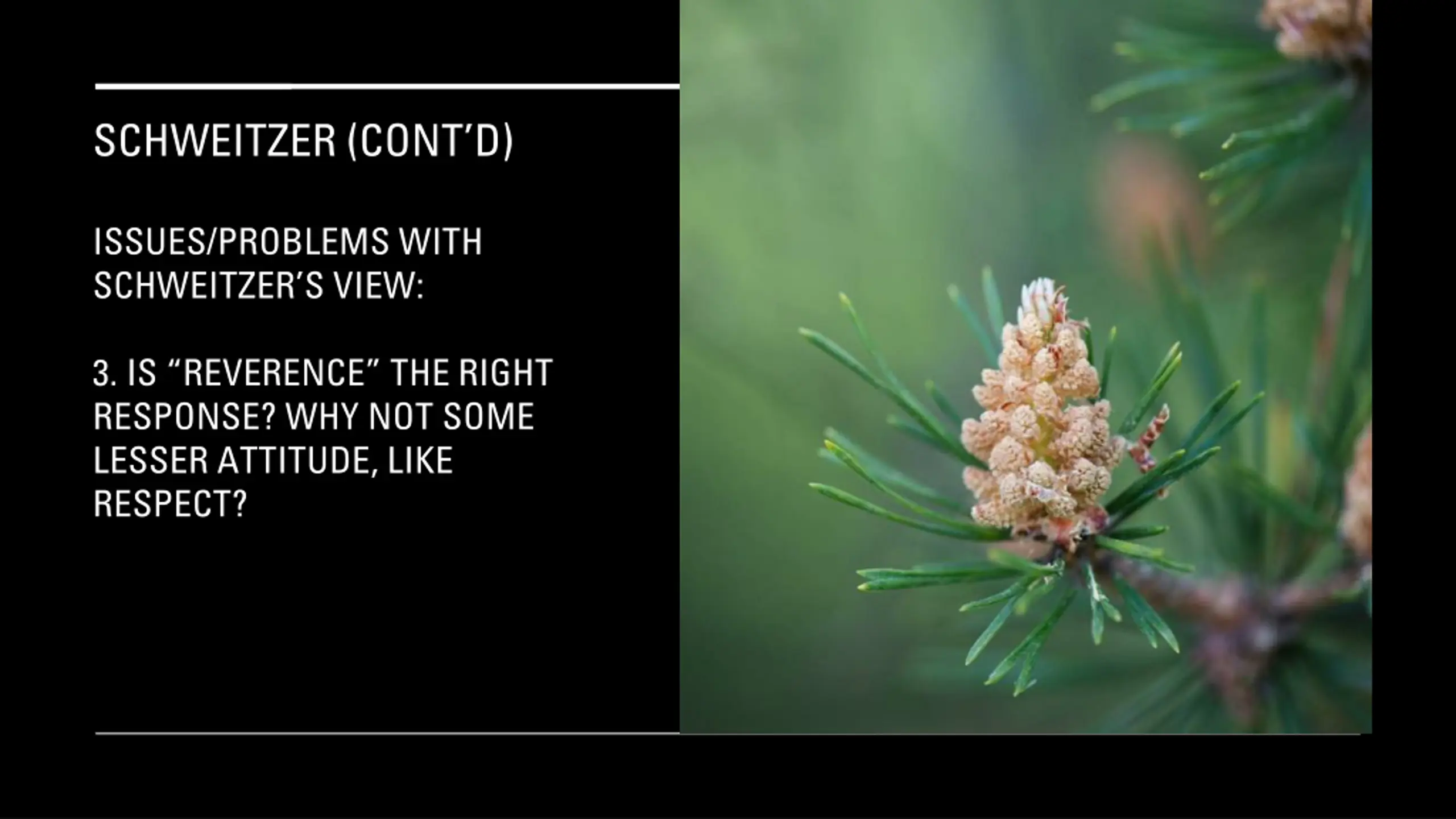 SCHWEITZER (CONTD) ISSUES/PROBLEMS WITH SCHWEITZER S VIEW: 3. IS REVERENCE THE RIGHT RESPONSE? WHY NOT SOME LESSER ATTITUDE, LIKE RESPECT?