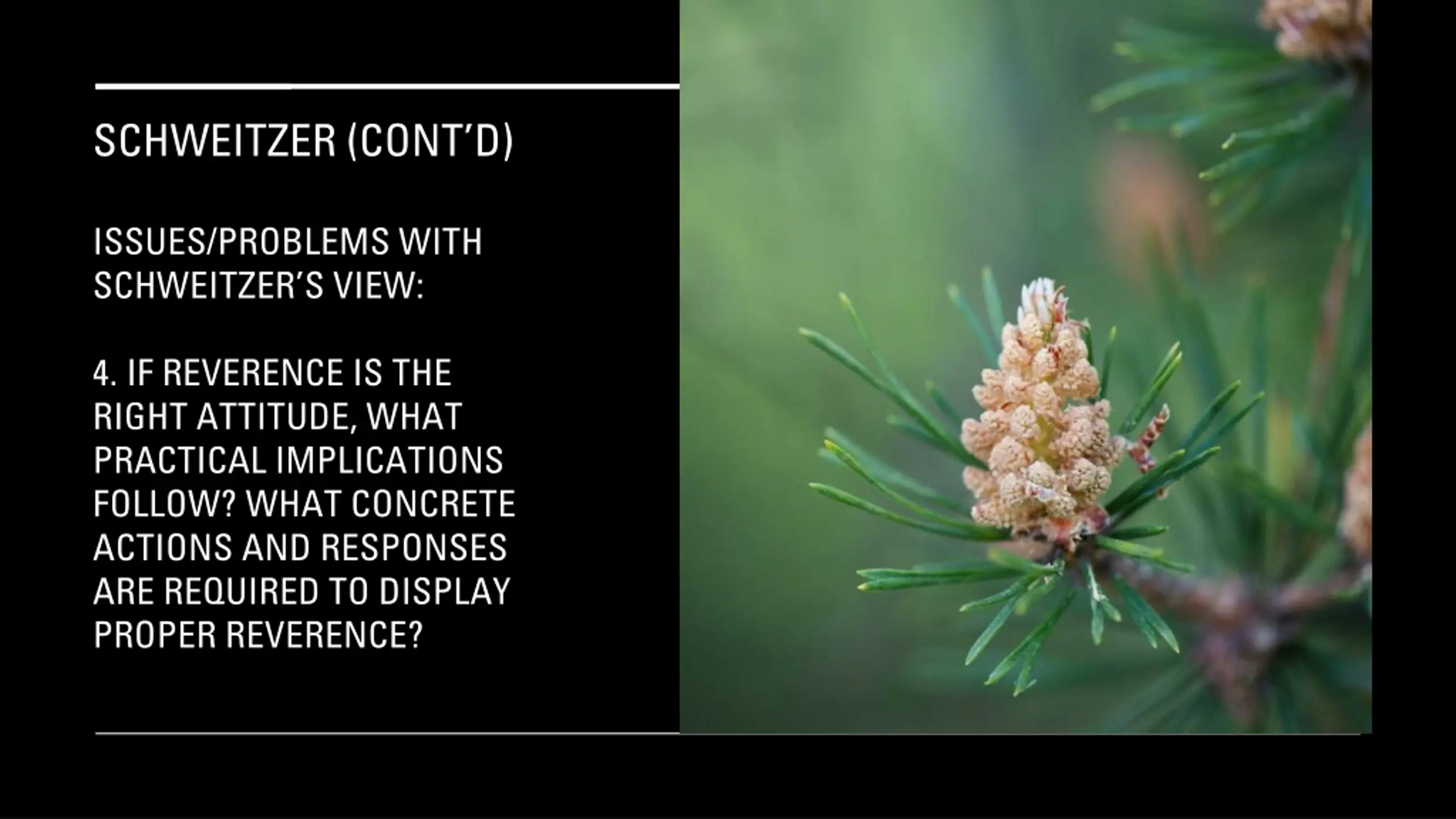 SCHWEITZER (CONTD) ISSUES/PROBLEMS WITH SCHWEITZER S VIEW: 4. IF REVERENCE IS THE RIGHT ATTITUDE, WHAT PRACTICAL IMPLICATIONS FOLLOW? WHAT CONCRETE ACTIONS AND RESPONSES ARE REQUIRED TO DISPLAY PROPER REVERENCE?