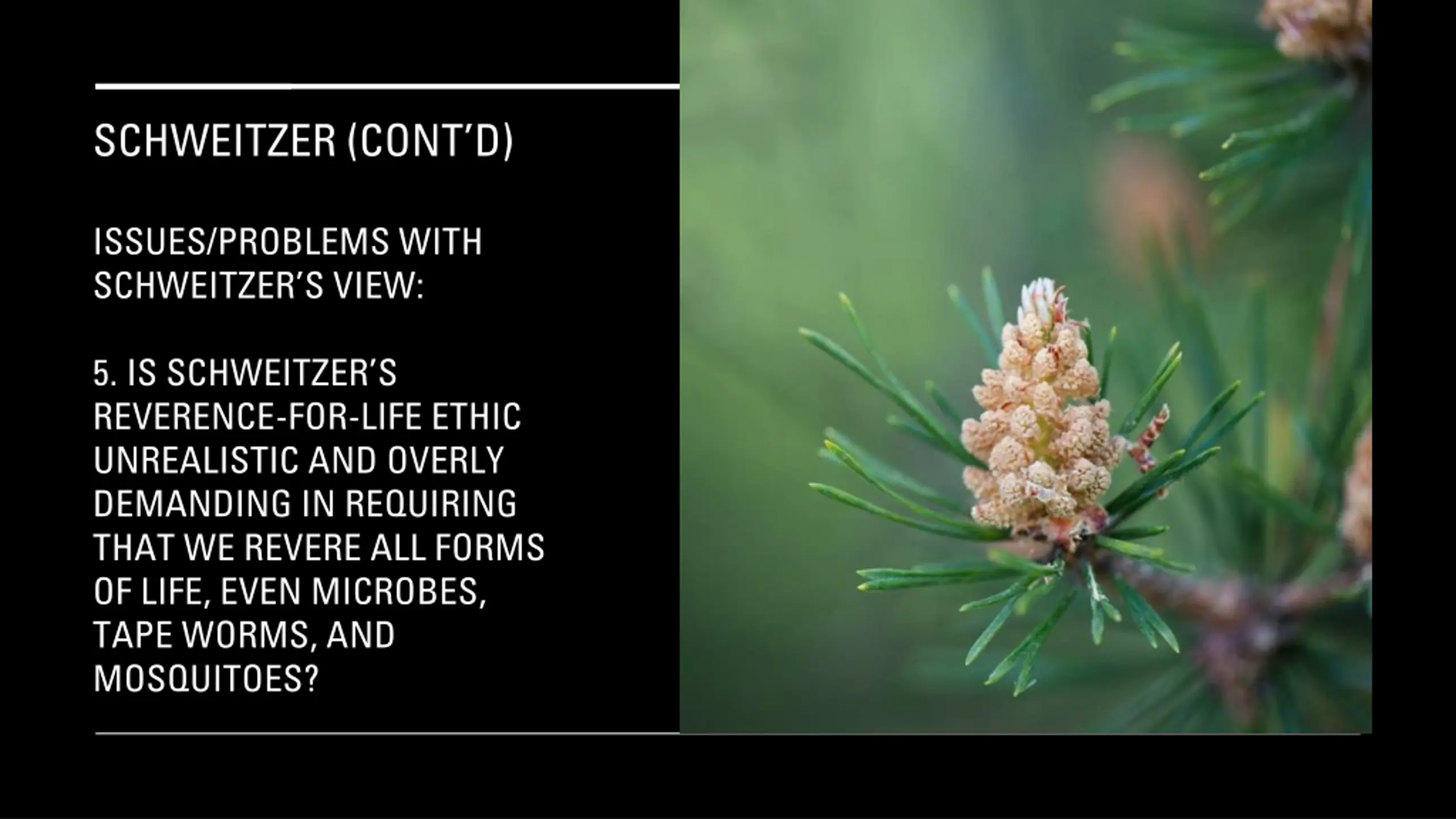 SCHWEITZER (CONTD) ISSUES/PROBLEMS WITH SCHWEITZER S VIEW: 5. IS SCHWEITZER S REVERENCE-FOR-LIFE ETHIC UNREALISTIC AND OVERLY DEMANDING IN REQUIRING THAT WE REVERE ALL FORMS OF LIFE, EVEN MICROBES, TAPE WORMS, AND MOSQUITOES?