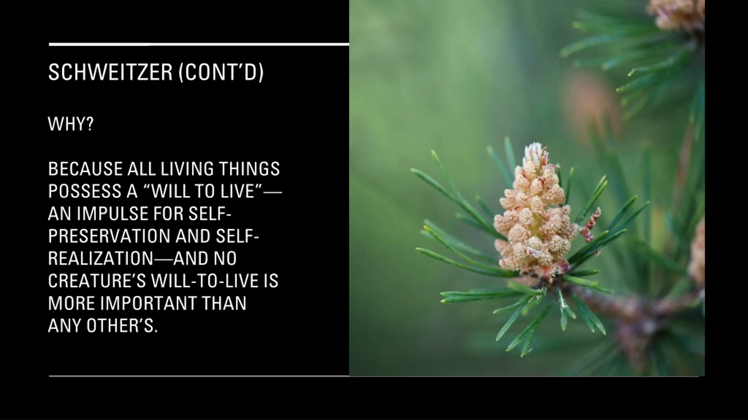 SCHWEITZER (CONTD) WHY? BECAUSE ALL LIVING THINGS POSSESS A WILL TO LIVE AN IMPULSE FOR SELF- PRESERVATION AND SELF- REALIZATION AND NO CREATURE S WILL-TO-LIVE IS MORE IMPORTANT THAN ANY OTHER S.
