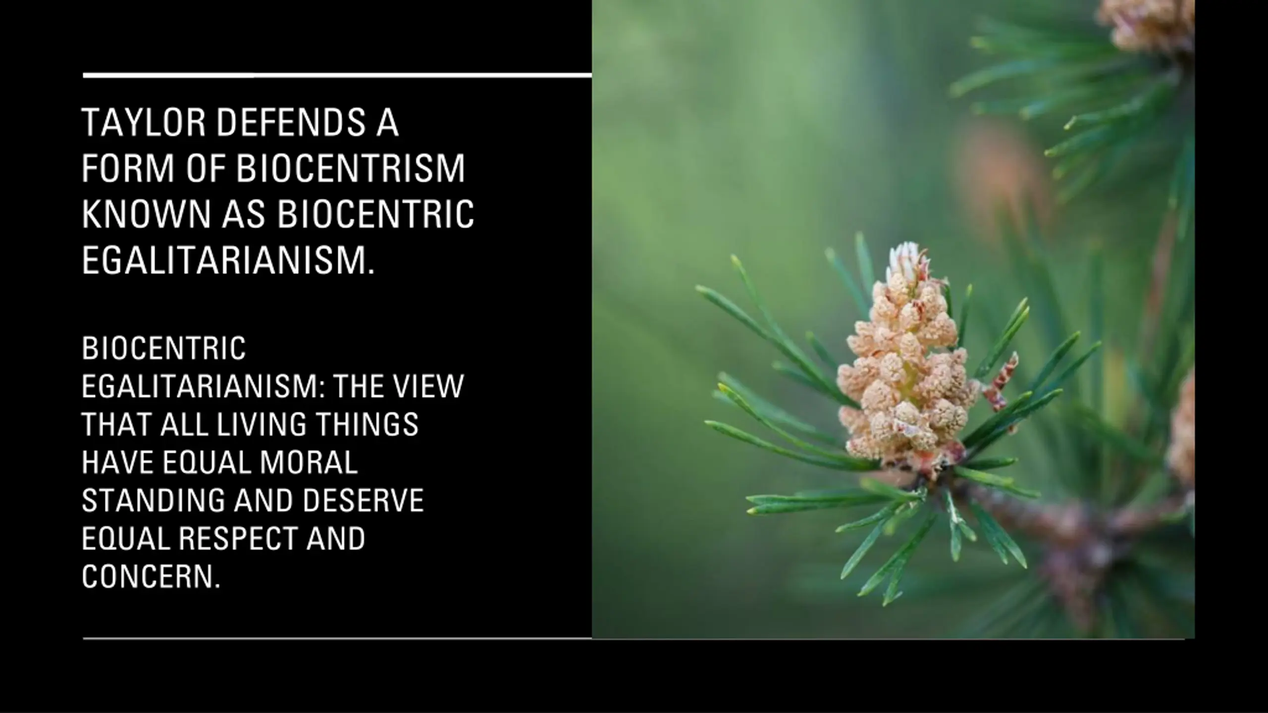 TAYLOR DEFENDS A FORM OF BIOCENTRISM KNOWN AS BIOCENTRIC EGALITARIANISM. BIOCENTRIC EGALITARIANISM: THE VIEW THAT ALL LIVING THINGS HAVE EQUAL MORAL STANDING AND DESERVE EQUAL RESPECT AND CONCERN.