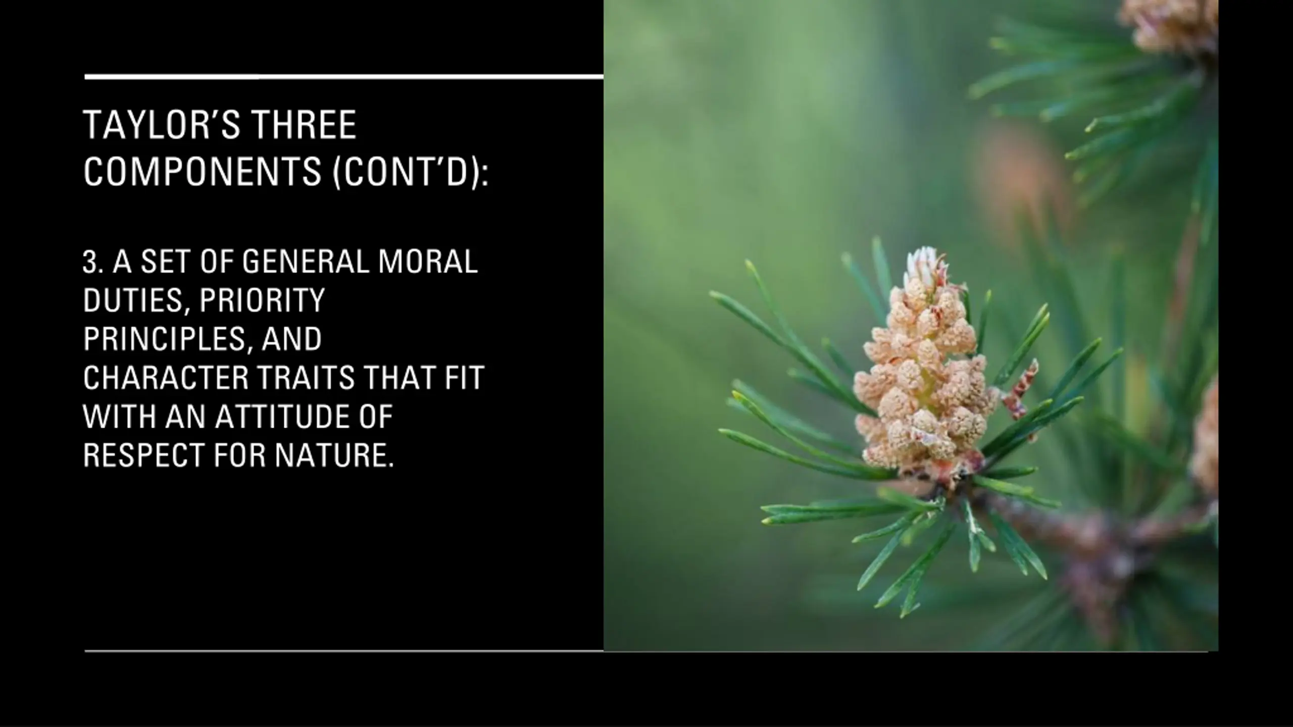 TAYLORS THREE COMPONENTS (CONT D): 3. A SET OF GENERAL MORAL DUTIES, PRIORITY PRINCIPLES, AND CHARACTER TRAITS THAT FIT WITH AN ATTITUDE OF RESPECT FOR NATURE.