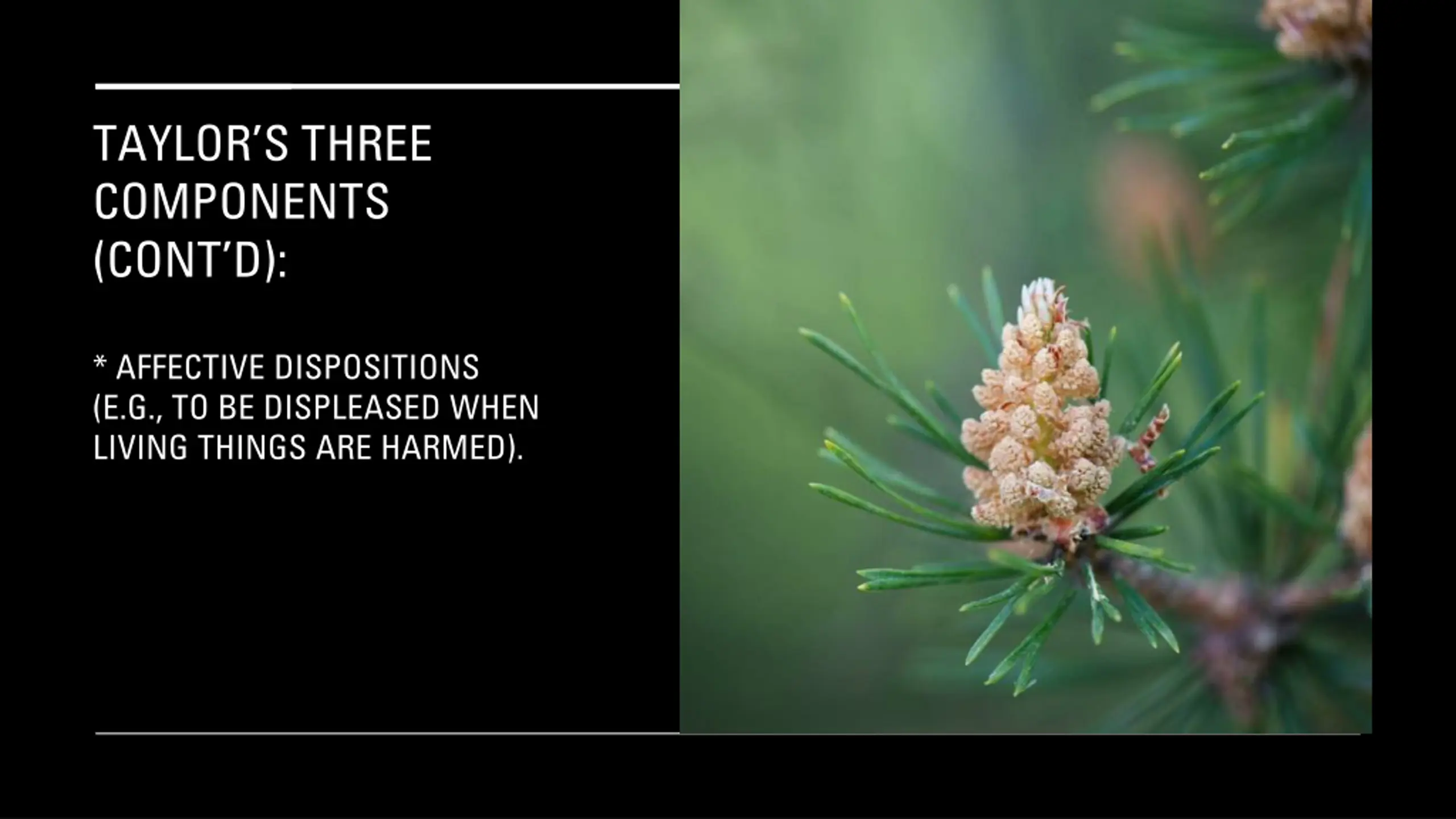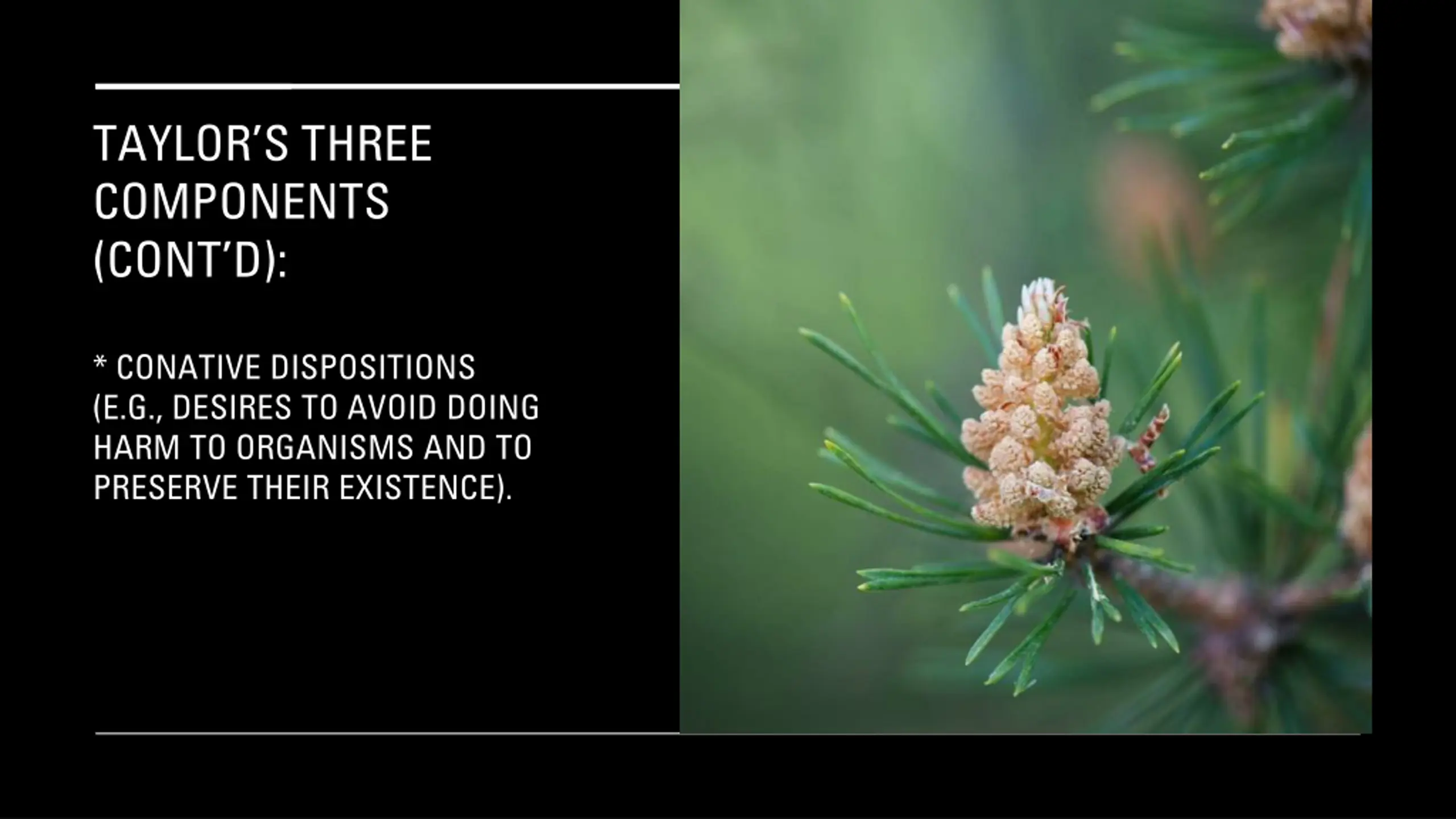 TAYLORS THREE COMPONENTS (CONT D): * CONATIVE DISPOSITIONS (E.G., DESIRES TO AVOID DOING HARM TO ORGANISMS AND TO PRESERVE THEIR EXISTENCE).