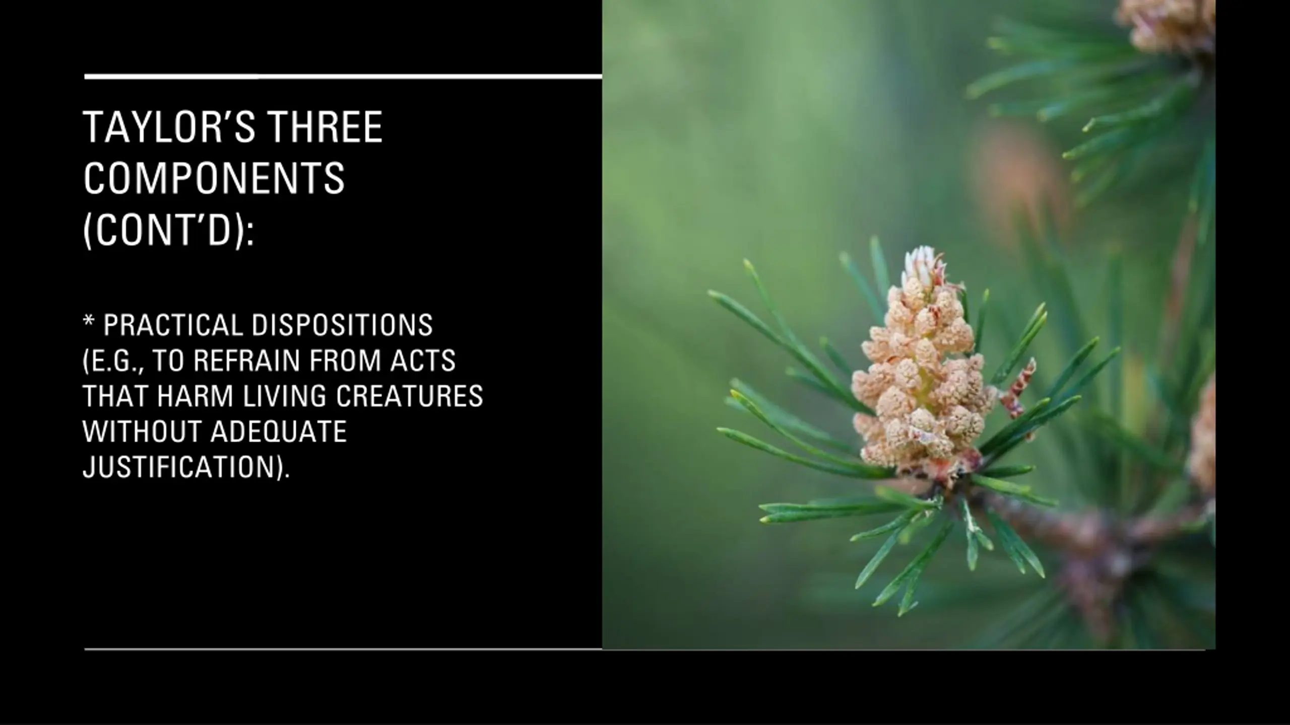TAYLORS THREE COMPONENTS (CONT D): * PRACTICAL DISPOSITIONS (E.G., TO REFRAIN FROM ACTS THAT HARM LIVING CREATURES WITHOUT ADEQUATE JUSTIFICATION).