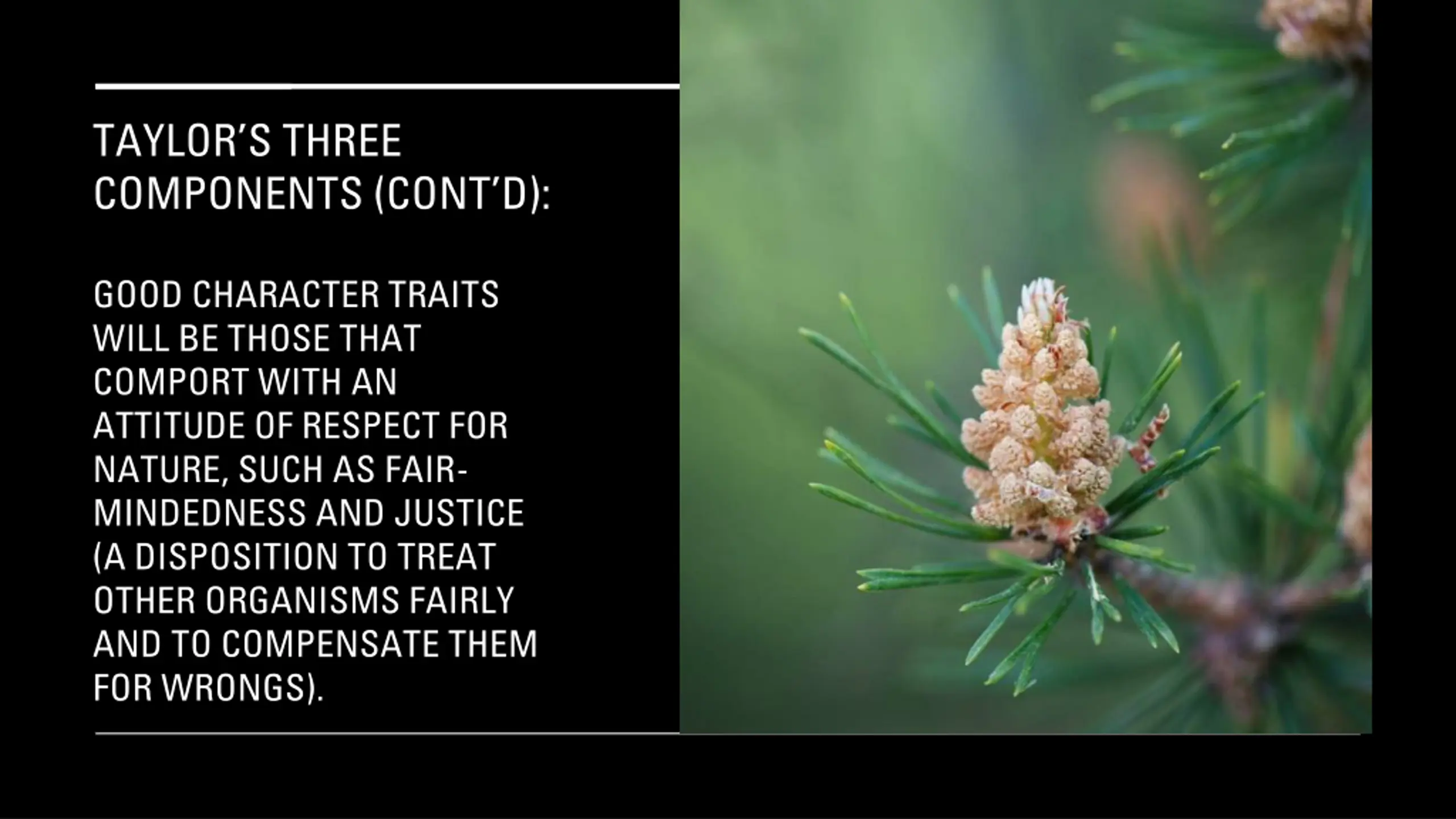 TAYLORS THREE COMPONENTS (CONT D): GOOD CHARACTER TRAITS WILL BE THOSE THAT COMPORT WITH AN ATTITUDE OF RESPECT FOR NATURE, SUCH AS FAIR- MINDEDNESS AND JUSTICE (A DISPOSITION TO TREAT OTHER ORGANISMS FAIRLY AND TO COMPENSATE THEM FOR WRONGS).
