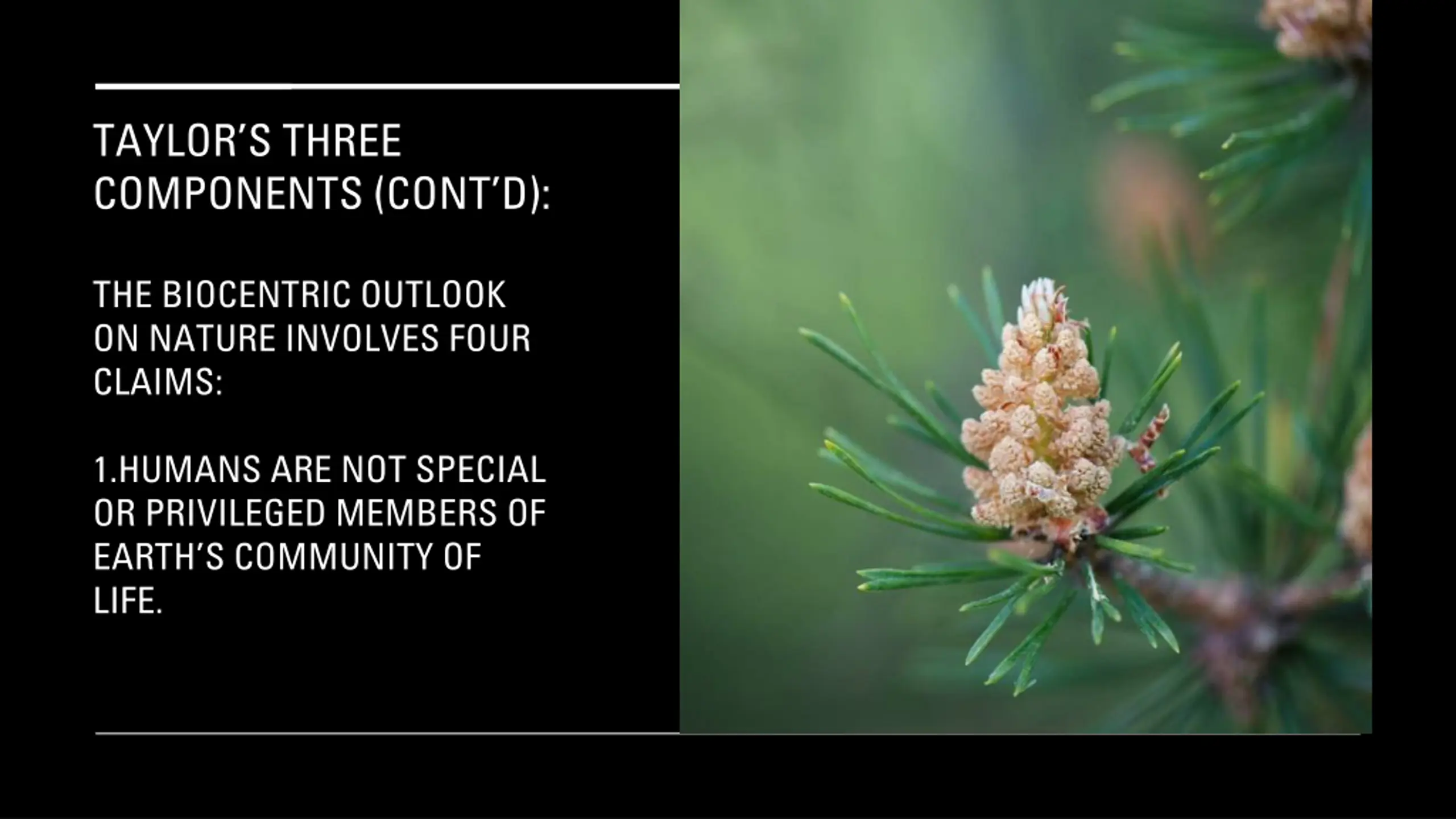 TAYLORS THREE COMPONENTS (CONT D): THE BIOCENTRIC OUTLOOK ON NATURE INVOLVES FOUR CLAIMS: 1.HUMANS ARE NOT SPECIAL OR PRIVILEGED MEMBERS OF EARTH S COMMUNITY OF LIFE.