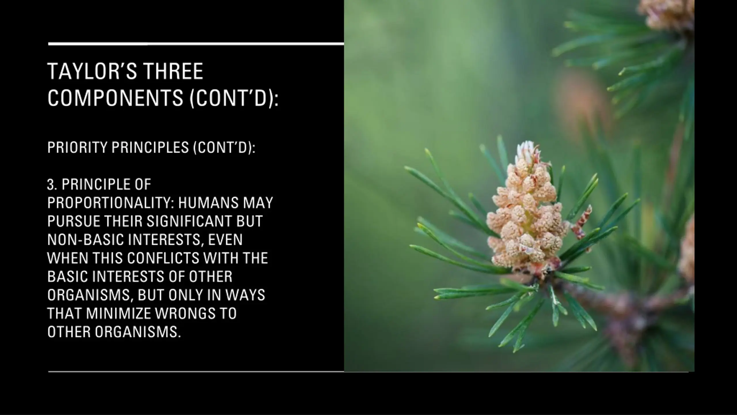 TAYLORS THREE COMPONENTS (CONT D): PRIORITY PRINCIPLES (CONT D): 3. PRINCIPLE OF PROPORTIONALITY: HUMANS MAY PURSUE THEIR SIGNIFICANT BUT NON-BASIC INTERESTS, EVEN WHEN THIS CONFLICTS WITH THE BASIC INTERESTS OF OTHER ORGANISMS, BUT ONLY IN WAYS THAT MINIMIZE WRONGS TO OTHER ORGANISMS.