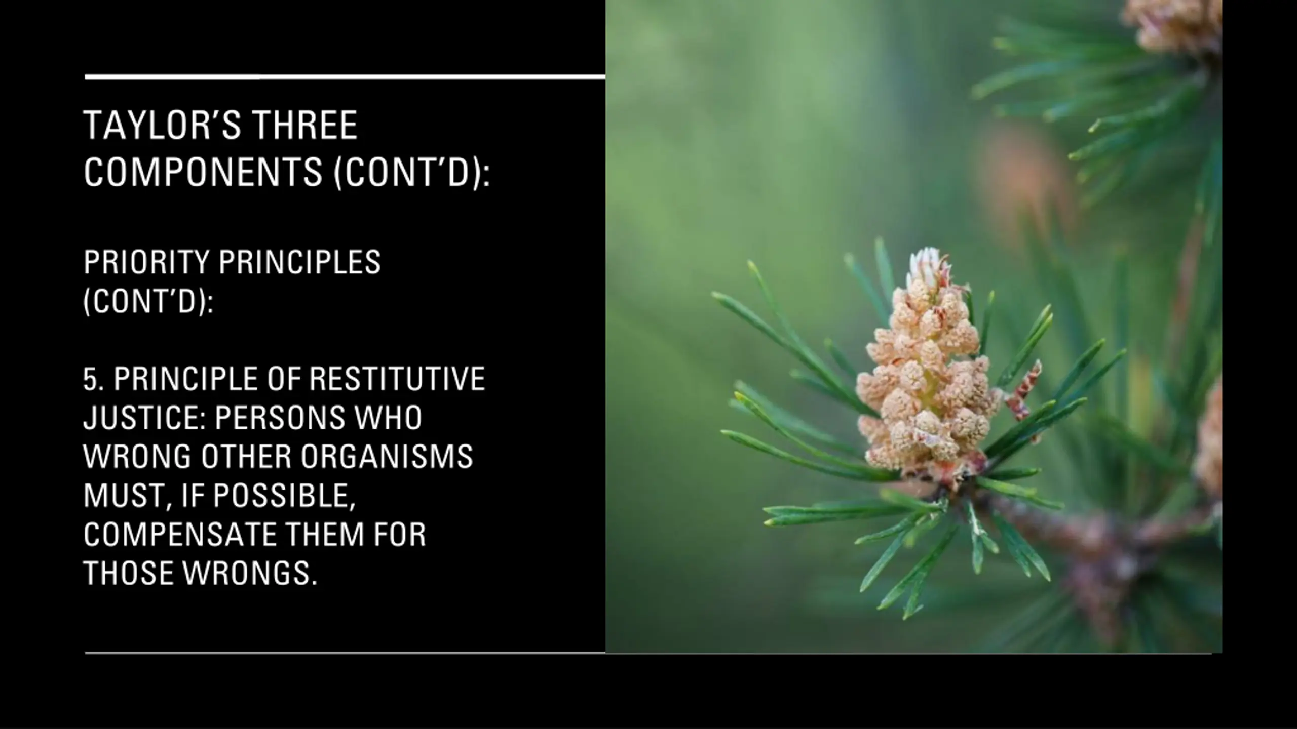 TAYLORS THREE COMPONENTS (CONT D): PRIORITY PRINCIPLES (CONT D): 5. PRINCIPLE OF RESTITUTIVE JUSTICE: PERSONS WHO WRONG OTHER ORGANISMS MUST, IF POSSIBLE, COMPENSATE THEM FOR THOSE WRONGS.