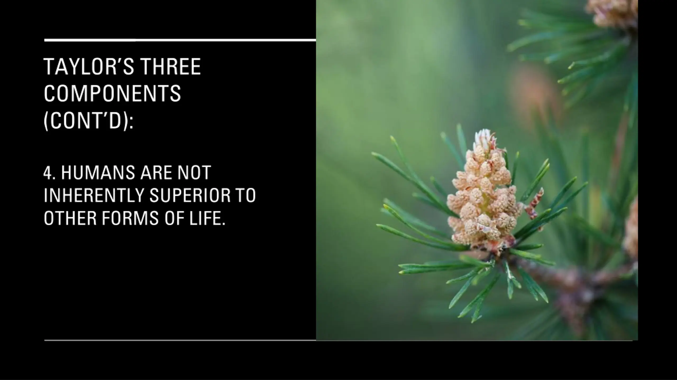 TAYLORS THREE COMPONENTS (CONT D): 4. HUMANS ARE NOT INHERENTLY SUPERIOR TO OTHER FORMS OF LIFE.
