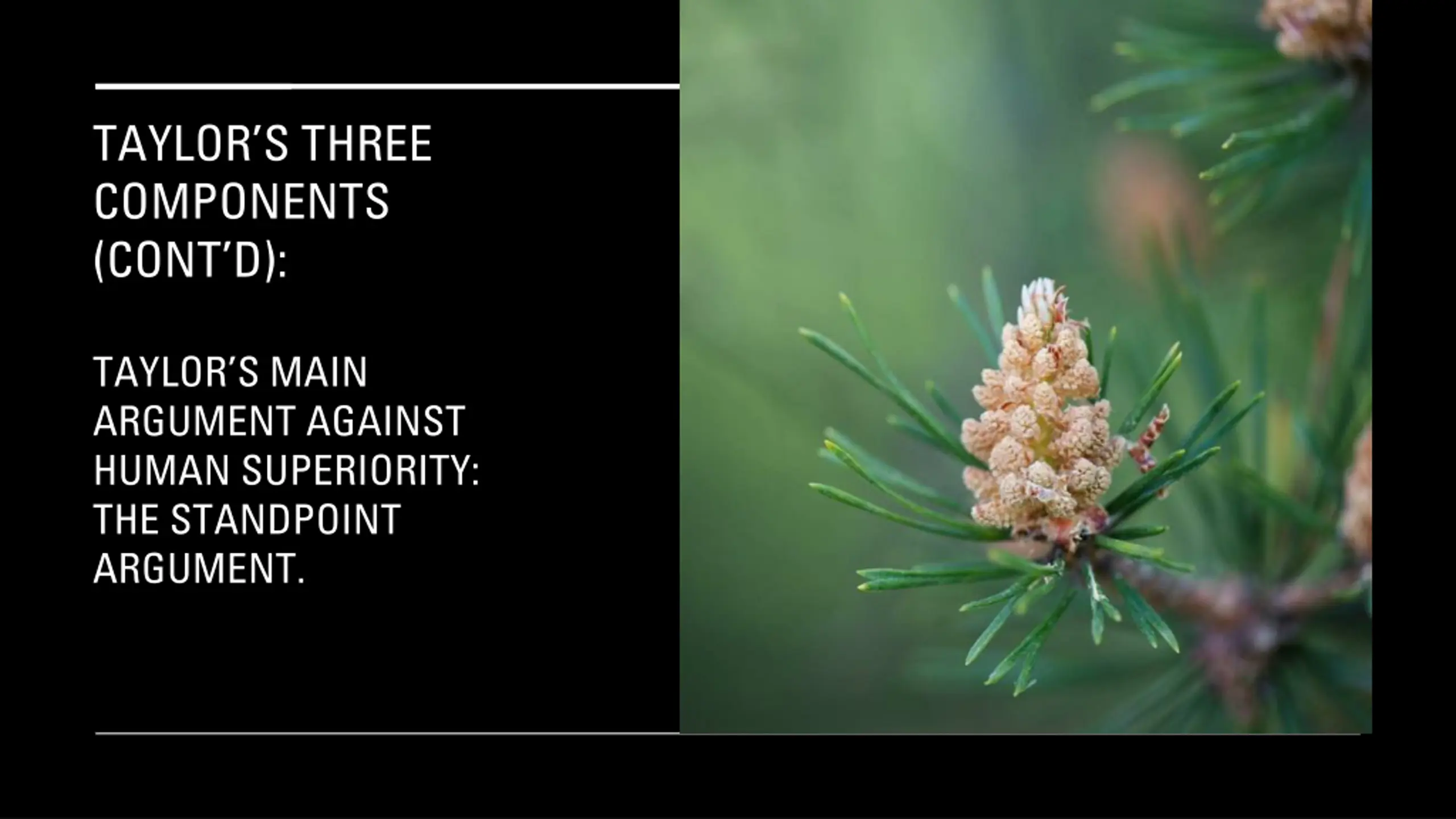 TAYLORS THREE COMPONENTS (CONT D): TAYLOR S MAIN ARGUMENT AGAINST HUMAN SUPERIORITY: THE STANDPOINT ARGUMENT.