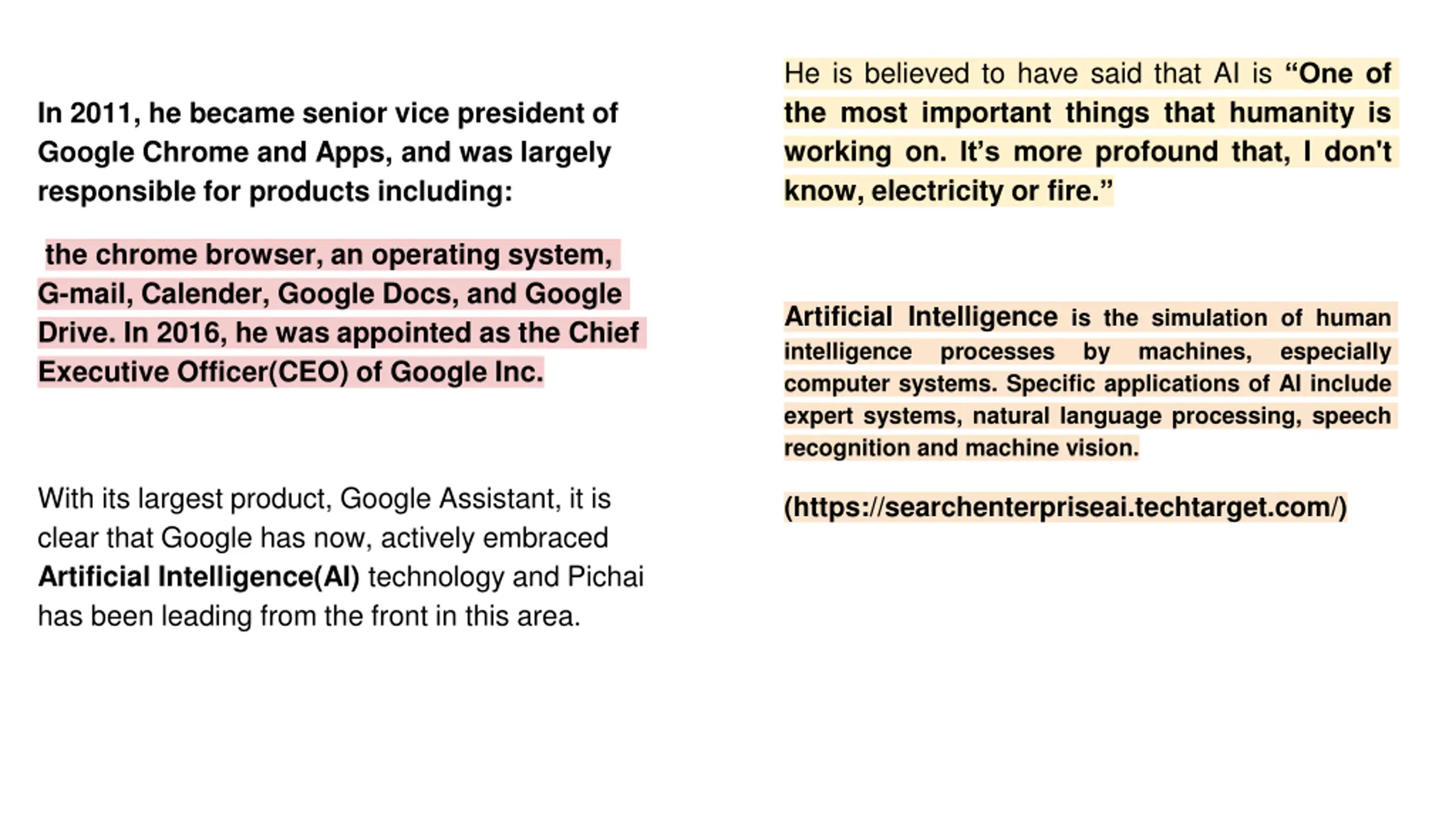 He is believed to have said that AI is One of the most important things that humanity is working on. It s more profound that, I don't know, electricity or fire. In 2011, he became senior vice president of Google Chrome and Apps, and was largely responsible for products including: the chrome browser, an operating system, G-mail, Calender, Google Docs, and Google Drive. In 2016, he was appointed as the Chief Executive Officer(CEO) of Google Inc. Artificial Intelligence is the simulation of human intelligence processes by computer systems. Specific applications of AI include expert systems, natural language processing, speech recognition and machine vision. machines, especially With its largest product, Google Assistant, it is clear that Google has now, actively embraced Artificial Intelligence(AI) technology and Pichai has been leading from the front in this area. (https://searchenterpriseai.techtarget.com/)