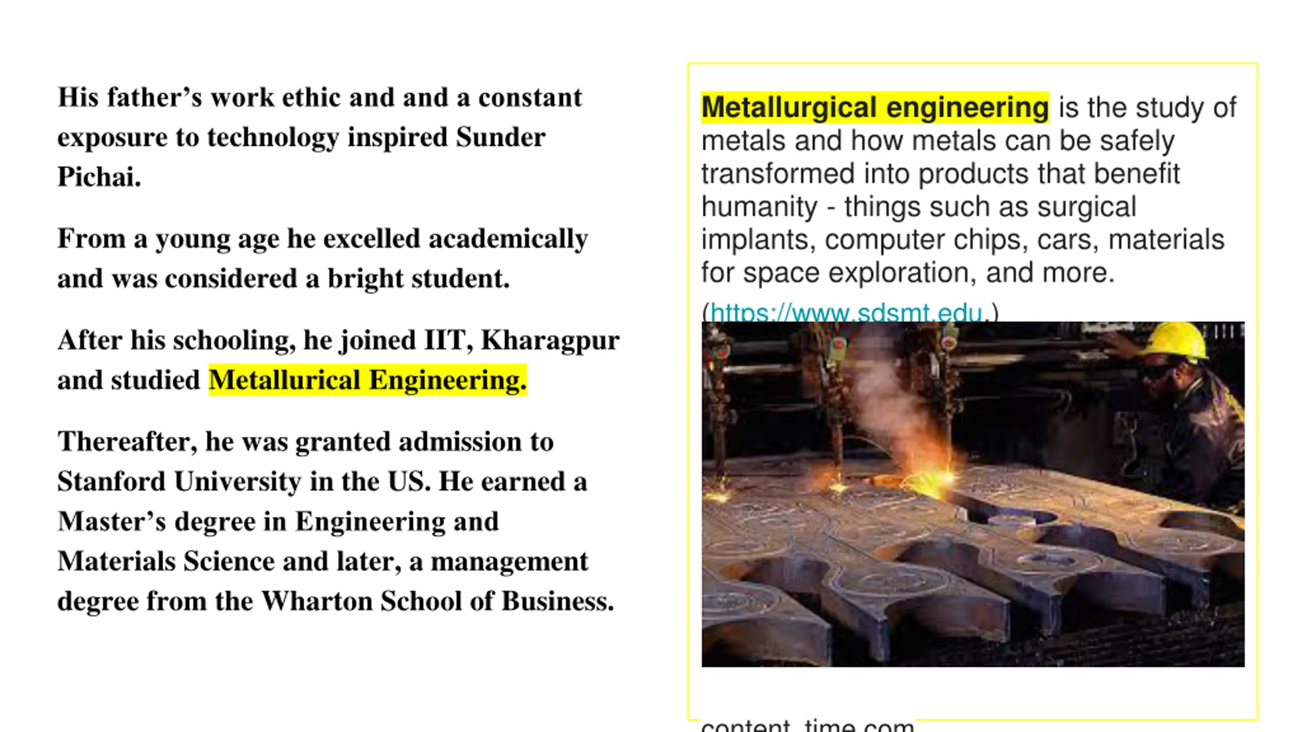 His fathers work ethic and and a constant exposure to technology inspired Sunder Pichai. Metallurgical engineering is the study of metals and how metals can be safely transformed into products that benefit humanity - things such as surgical implants, computer chips, cars, materials for space exploration, and more. (https://www.sdsmt.edu.) From a young age he excelled academically and was considered a bright student. After his schooling, he joined IIT, Kharagpur and studied Metallurical Engineering. Thereafter, he was granted admission to Stanford University in the US. He earned a Master s degree in Engineering and Materials Science and later, a management degree from the Wharton School of Business. content. time.com