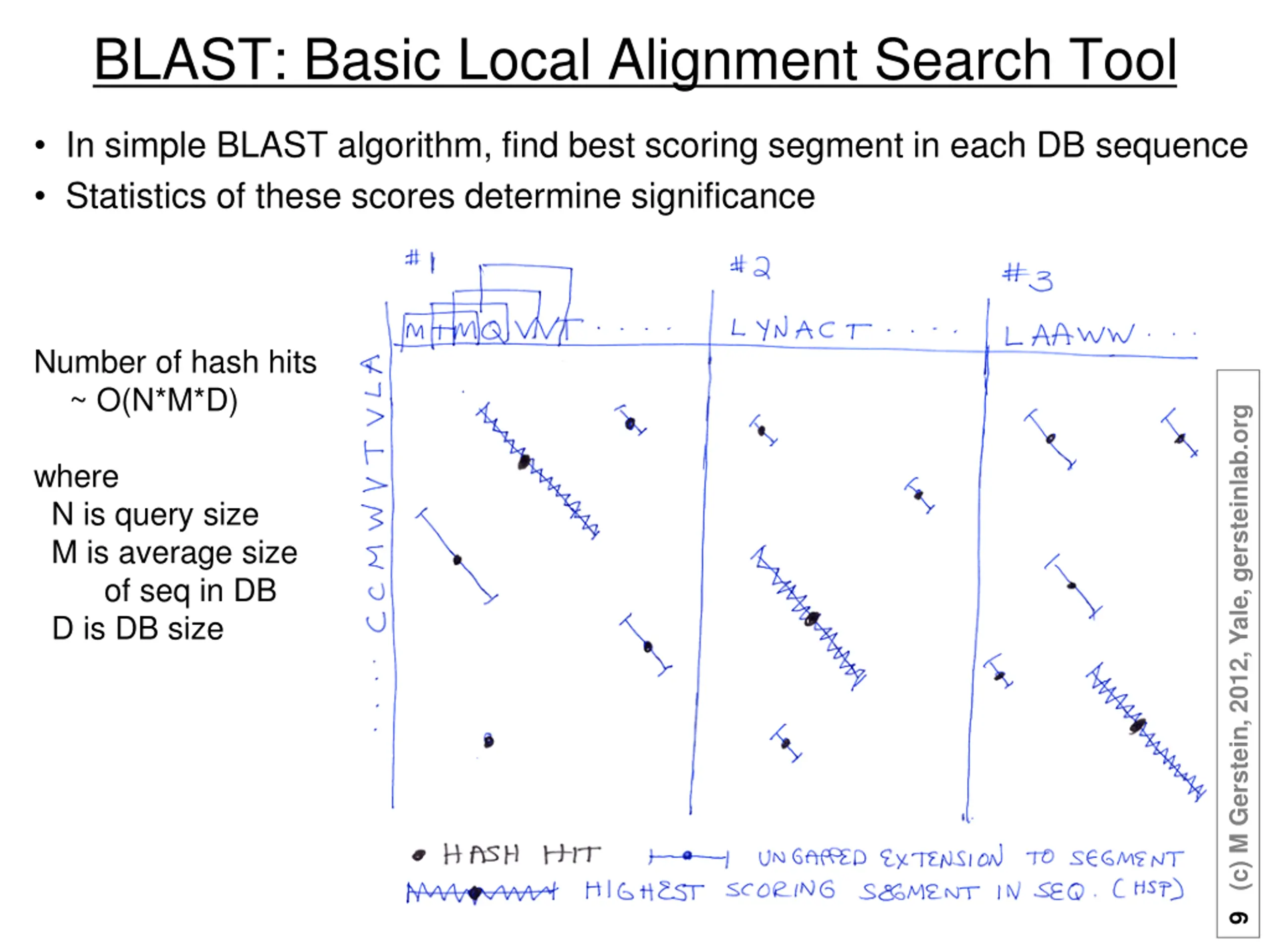 BLAST: Basic Local Alignment Search Tool In simple BLAST algorithm, find best scoring segment in each DB sequence Statistics of these scores determine significance Number of hash hits ~ O(N*M*D) 9 (c) M Gerstein, 2012, Yale, gersteinlab.org where N is query size M is average size of seq in DB D is DB size