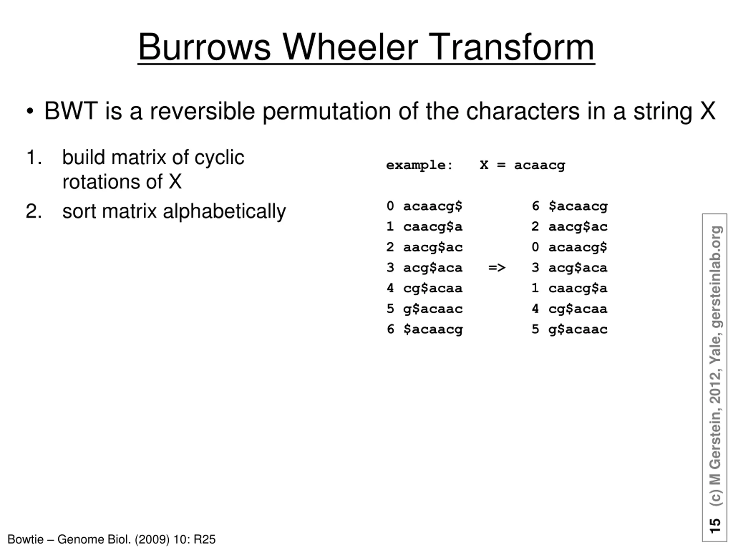 Burrows Wheeler Transform BWT is a reversible permutation of the characters in a string X 1. build matrix of cyclic rotations of X sort matrix alphabetically example: X = acaacg 0 acaacg$ 6 $acaacg 1 caacg$a 2 aacg$ac 2 aacg$ac 0 acaacg$ 3 acg$aca => 3 acg$aca 4 cg$acaa 1 caacg$a 5 g$acaac 4 cg$acaa 6 $acaacg 5 g$acaac 2. 15 (c) M Gerstein, 2012, Yale, gersteinlab.org Bowtie Genome Biol. (2009) 10: R25