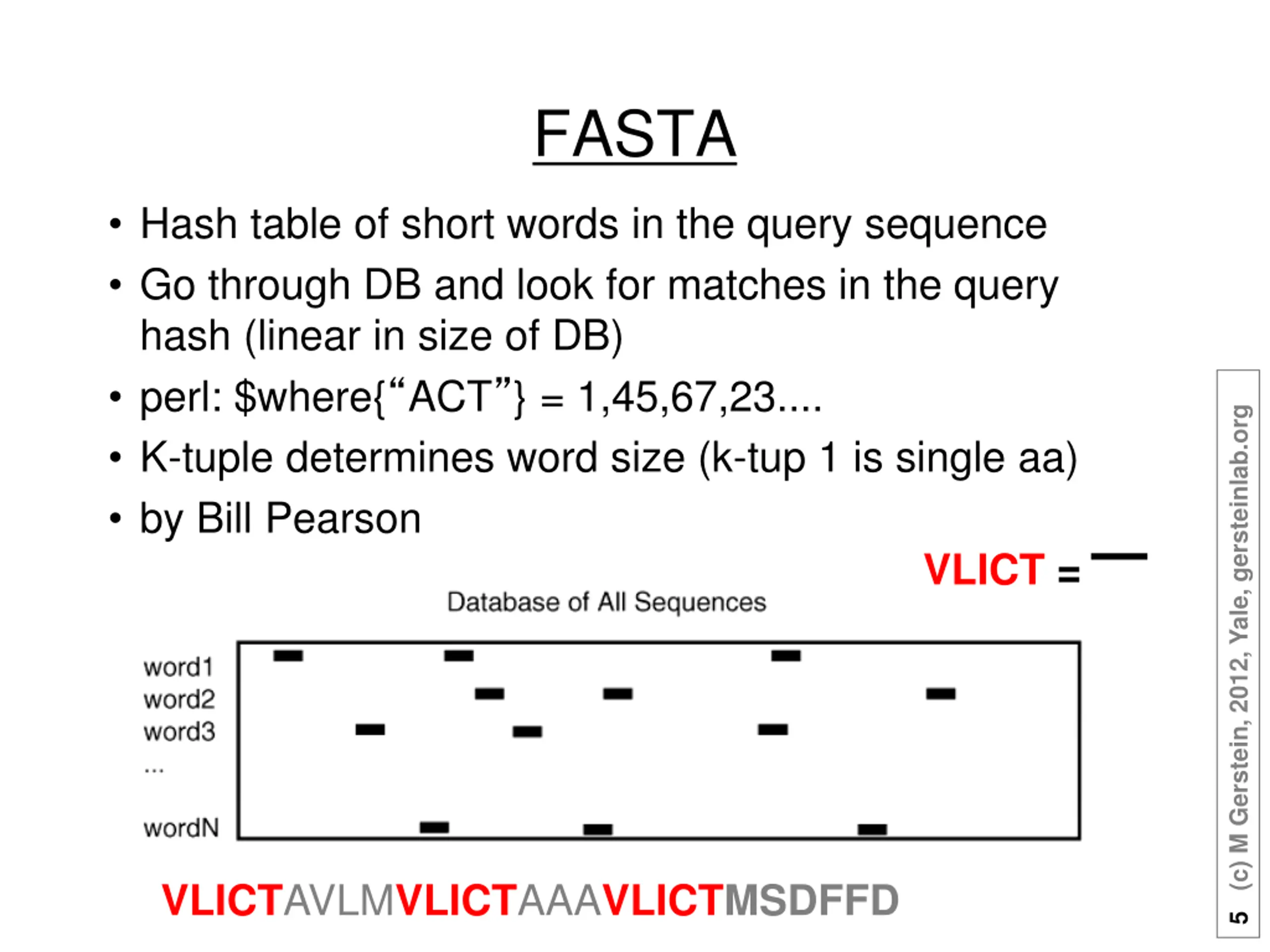 FASTA Hash table of short words in the query sequence Go through DB and look for matches in the query hash (linear in size of DB) perl: $where{ ACT } = 1,45,67,23.... K-tuple determines word size (k-tup 1 is single aa) by Bill Pearson 5 (c) M Gerstein, 2012, Yale, gersteinlab.org VLICT = _ VLICTAVLMVLICTAAAVLICTMSDFFD