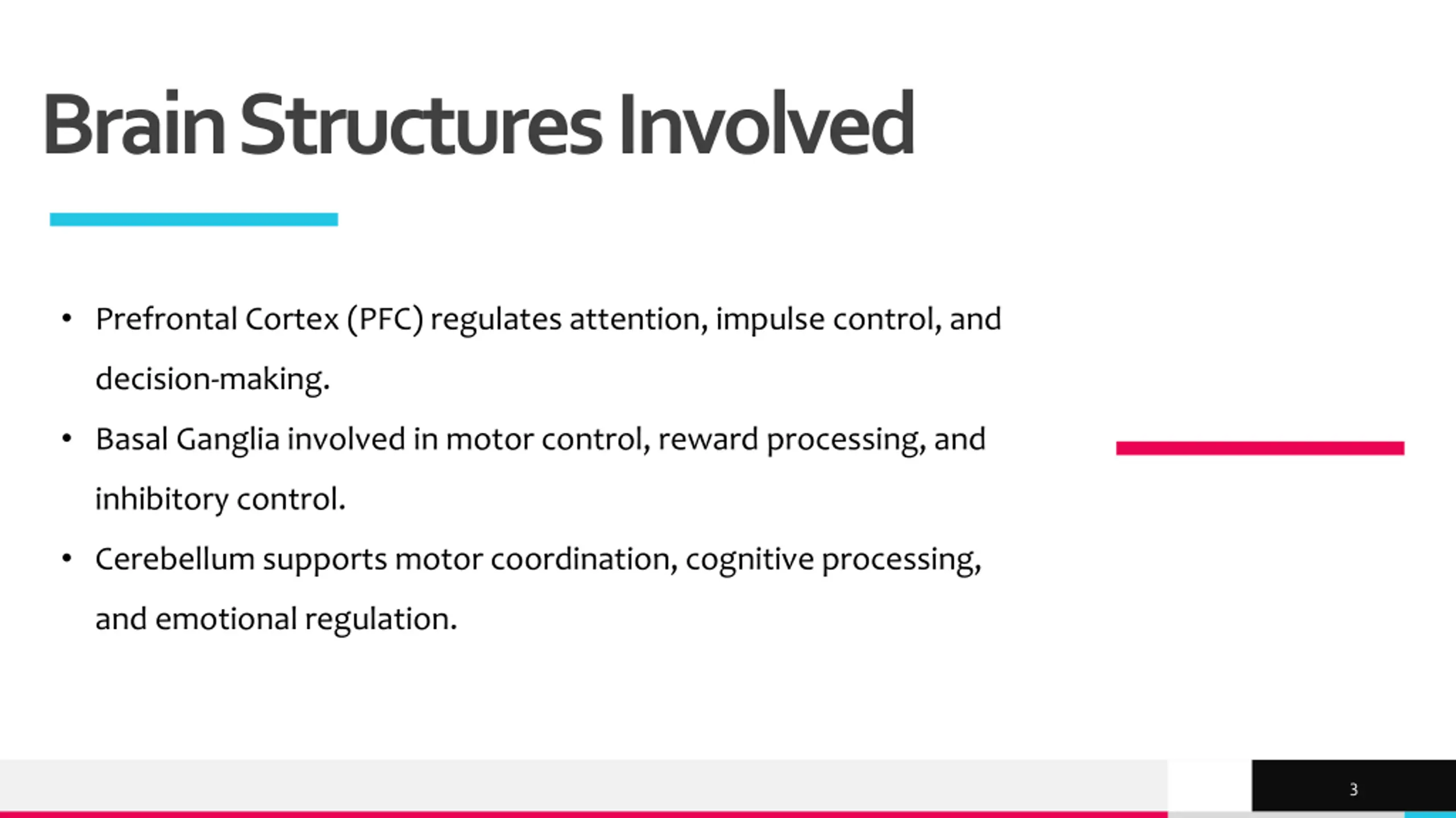 Brain Structures Involved Prefrontal Cortex (PFC) regulates attention, impulse control, and decision-making. Basal Ganglia involved in motor control, reward processing, and inhibitory control. Cerebellum supports motor coordination, cognitive processing, and emotional regulation. TREY research 3