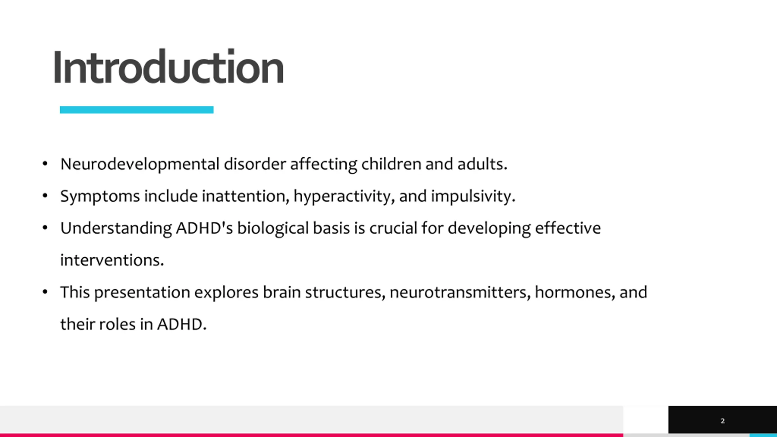 Introduction Neurodevelopmental disorder affecting children and adults. Symptoms include inattention, hyperactivity, and impulsivity. Understanding ADHD's biological basis is crucial for developing effective interventions. This presentation explores brain structures, neurotransmitters, hormones, and their roles in ADHD. TREY research 2