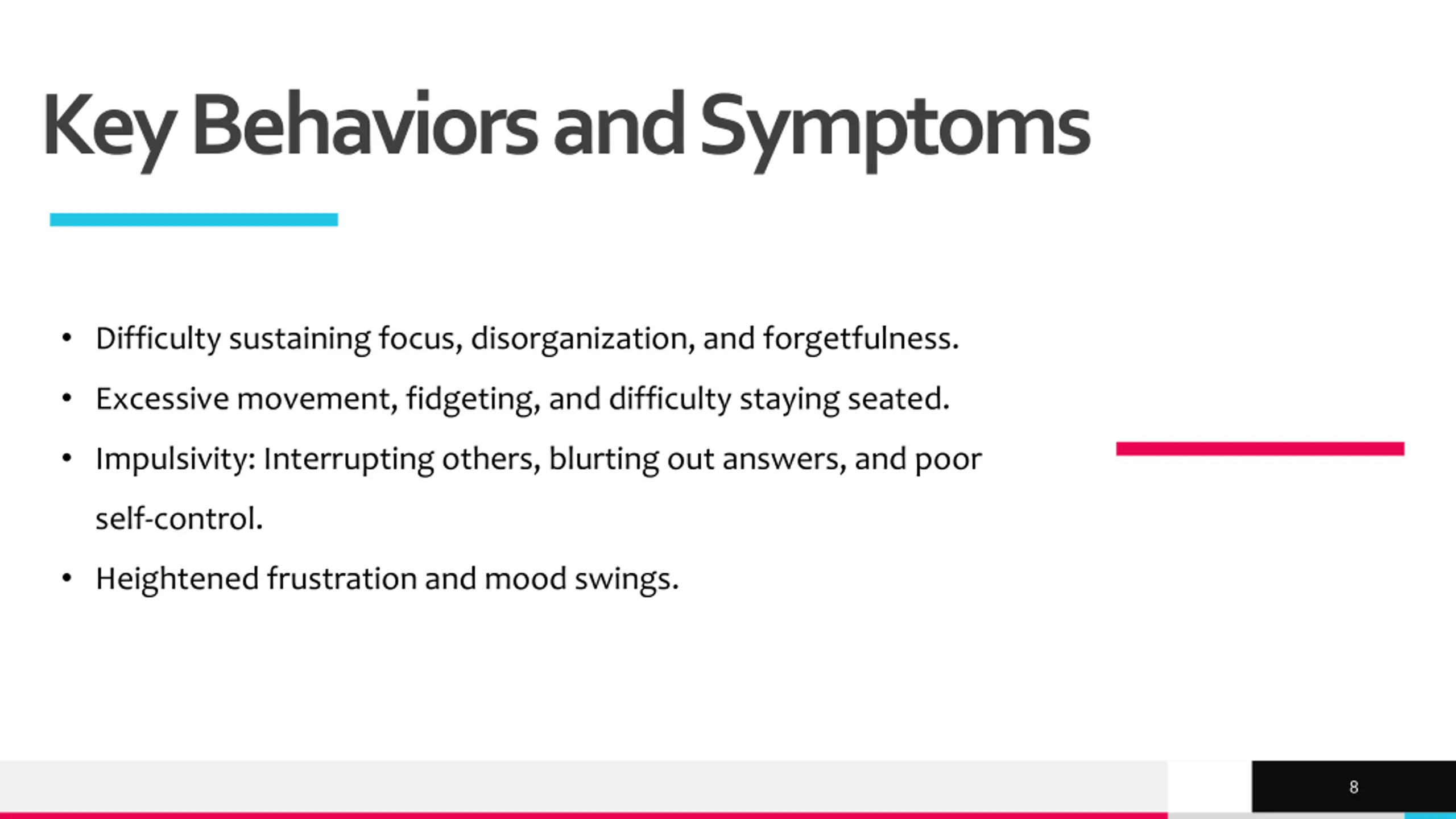 Key Behaviors and Symptoms Difficulty sustaining focus, disorganization, and forgetfulness. Excessive movement, fidgeting, and difficulty staying seated. Impulsivity: Interrupting others, blurting out answers, and poor self-control. Heightened frustration and mood swings. TREY research 8