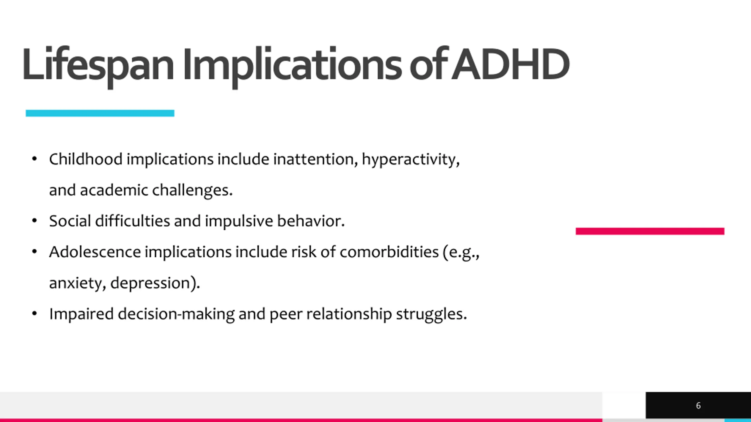 Lifespan Implications of ADHD Childhood implications include inattention, hyperactivity, and academic challenges. Social difficulties and impulsive behavior. Adolescence implications include risk of comorbidities (e.g., anxiety, depression). Impaired decision-making and peer relationship struggles. TREY research 6