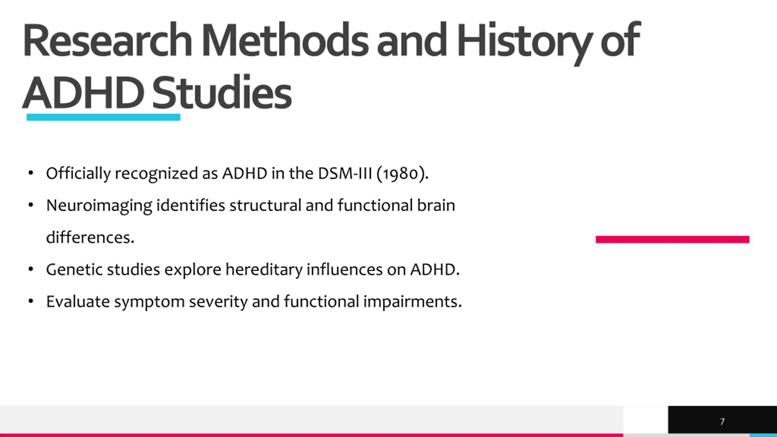 Research Methods and History of ADHD Studies Officially recognized as ADHD in the DSM-III (1980). Neuroimaging identifies structural and functional brain differences. Genetic studies explore hereditary influences on ADHD. Evaluate symptom severity and functional impairments. TREY research 7