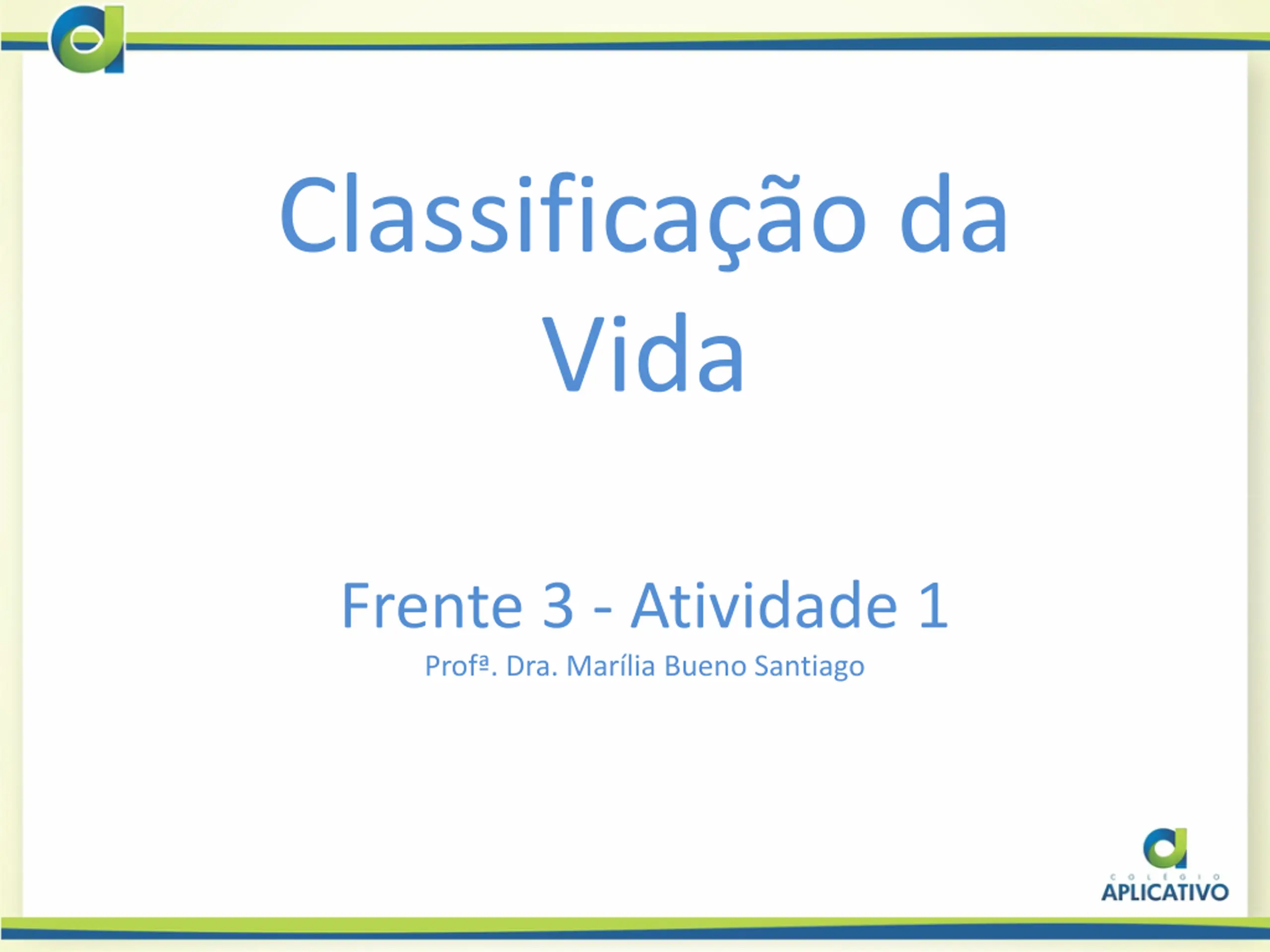 Classificao da Vida Frente 3 - Atividade 1 Prof . Dra. Mar lia Bueno Santiago