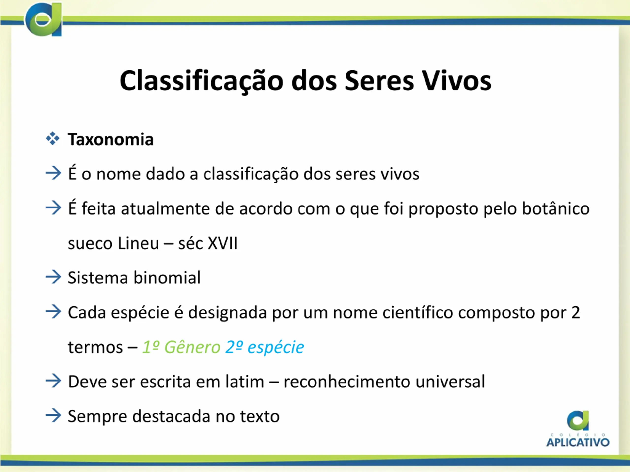 Classificao dos Seres Vivos Taxonomia o nome dado a classifica o dos seres vivos feita atualmente de acordo com o que foi proposto pelo bot nico sueco Lineu s c XVII Sistema binomial Cada esp cie designada por um nome cient fico composto por 2 termos 1 G nero 2 esp cie Deve ser escrita em latim reconhecimento universal Sempre destacada no texto