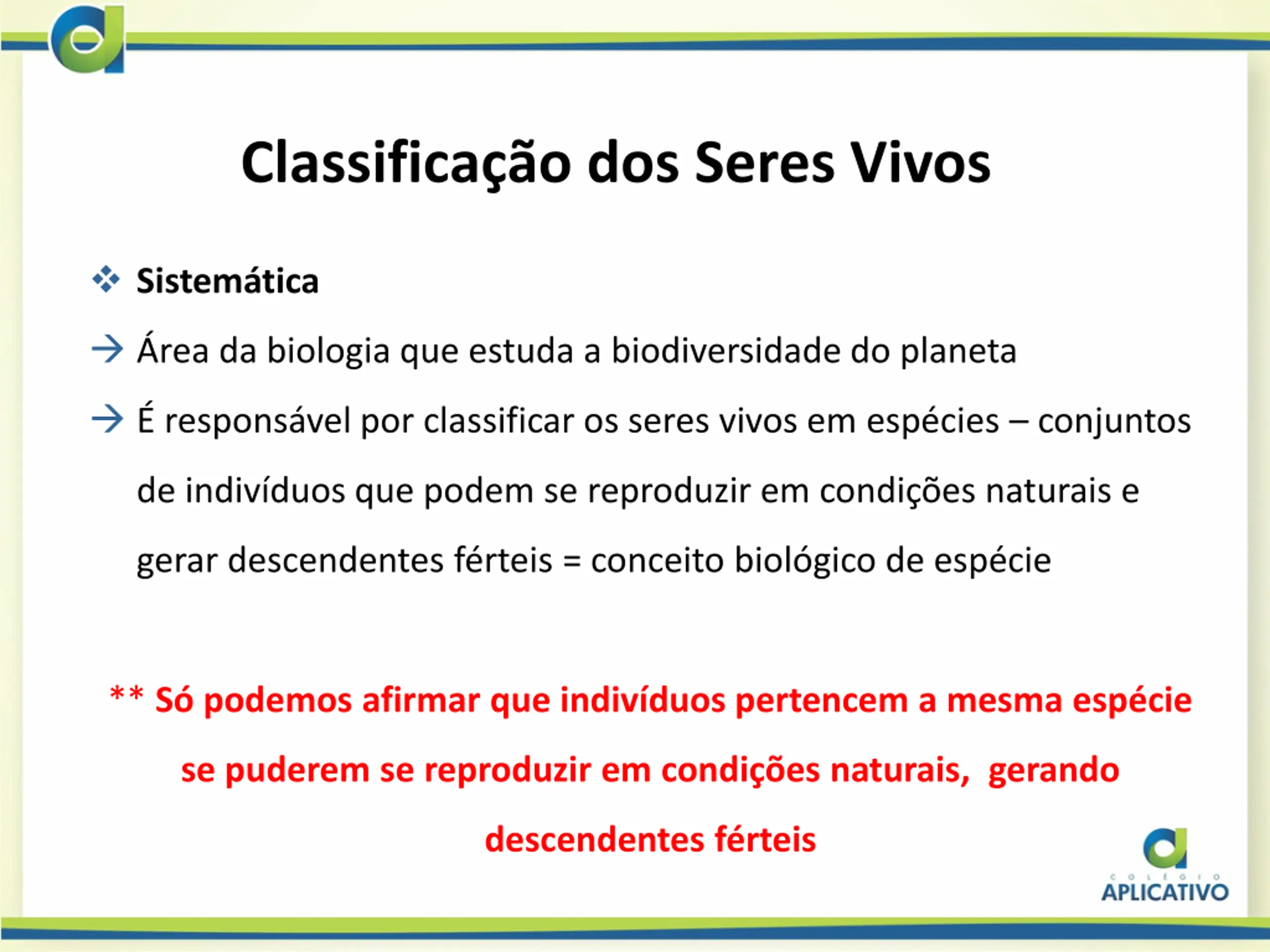 Classificao dos Seres Vivos Sistem tica rea da biologia que estuda a biodiversidade do planeta respons vel por classificar os seres vivos em esp cies conjuntos de indiv duos que podem se reproduzir em condi es naturais e gerar descendentes f rteis = conceito biol gico de esp cie ** S podemos afirmar que indiv duos pertencem a mesma esp cie se puderem se reproduzir em condi es naturais, gerando descendentes f rteis
