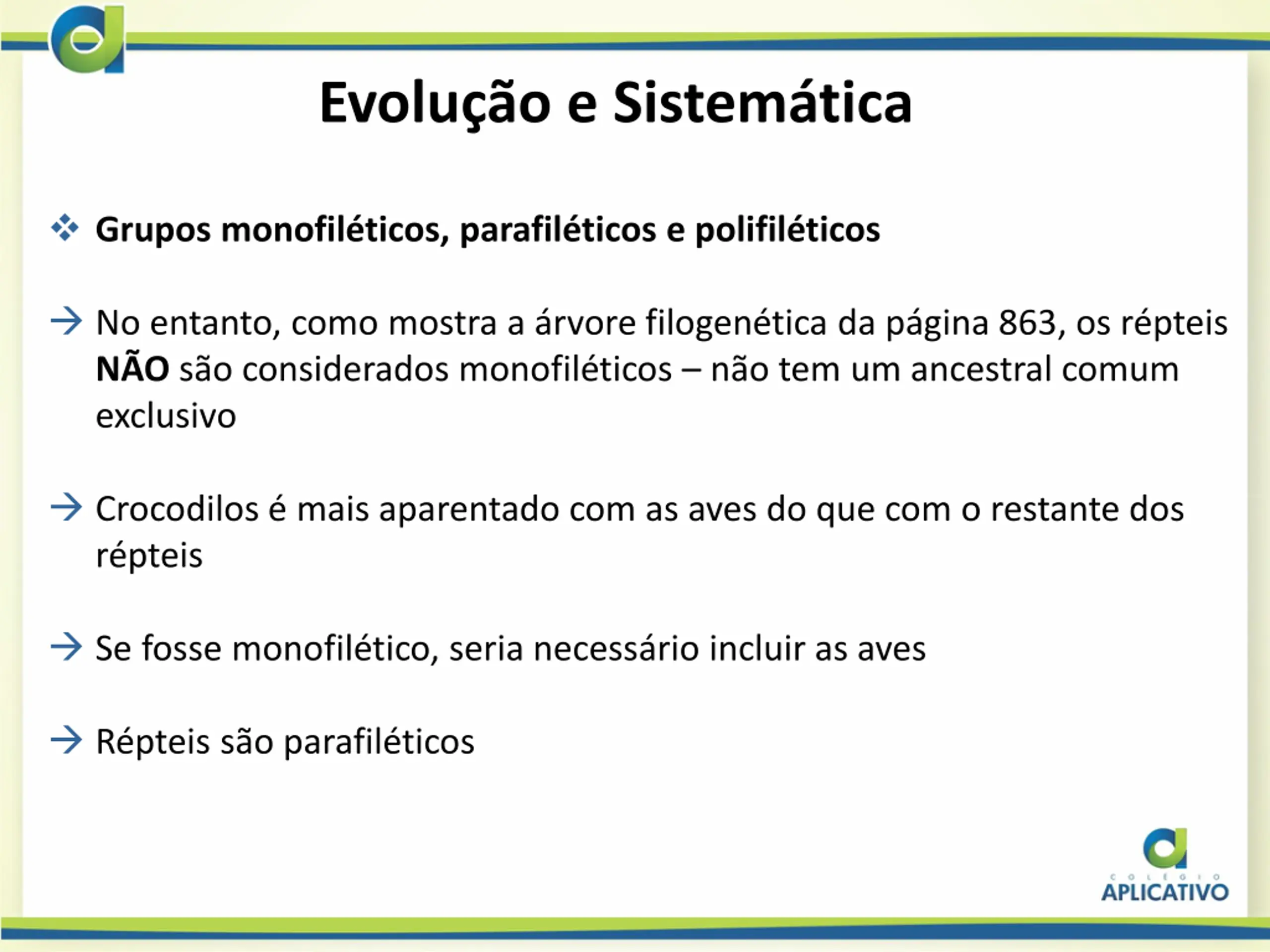 Evoluo e Sistemtica Grupos monofil ticos, parafil ticos e polifil ticos No entanto, como mostra a rvore filogen tica da p gina 863, os r pteis N O s o considerados monofil ticos n o tem um ancestral comum exclusivo Crocodilos mais aparentado com as aves do que com o restante dos r pteis Se fosse monofil tico, seria necess rio incluir as aves R pteis s o parafil ticos